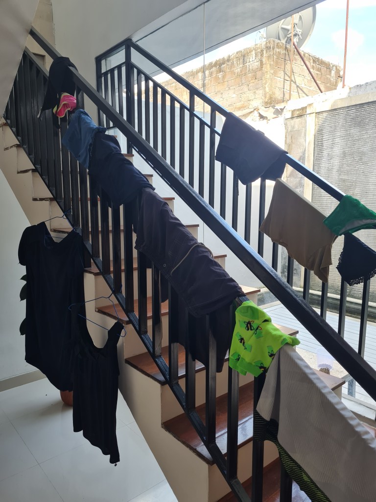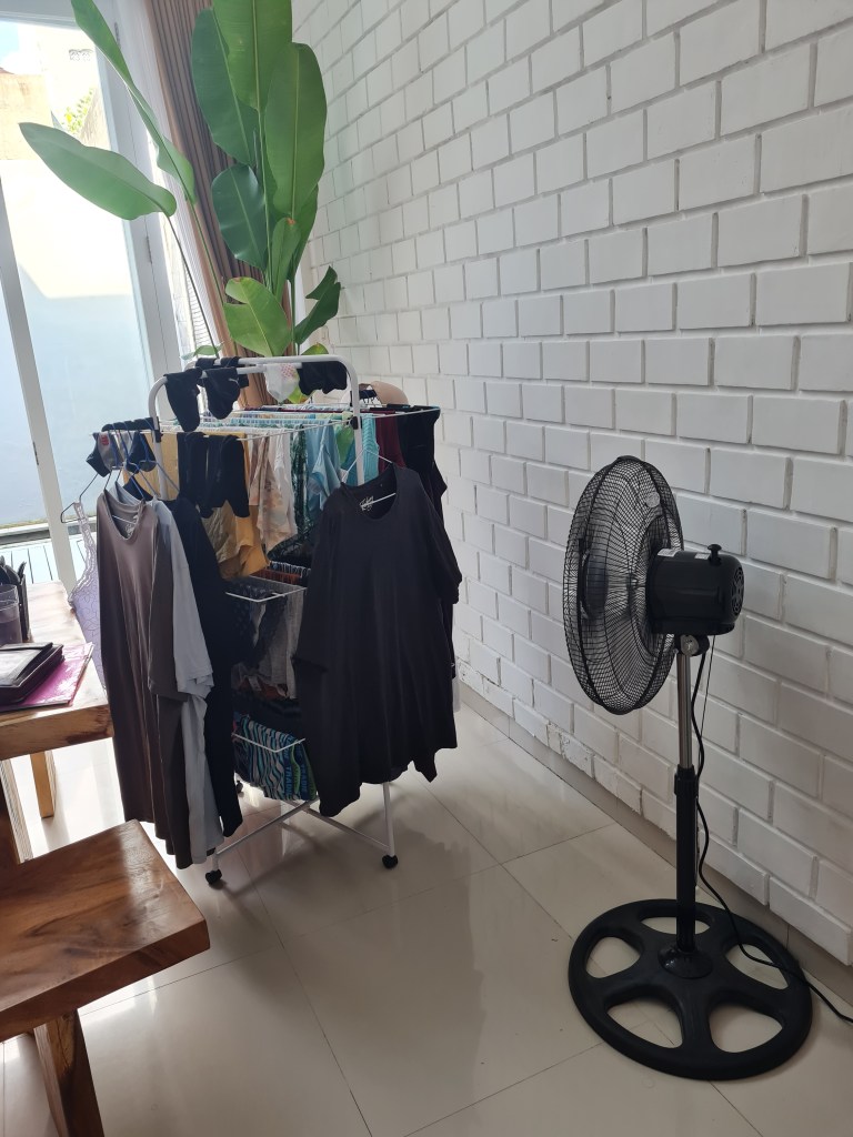 We spent our first two nights back in Bali staying in a cheap Airbnb with a washing machine (which was a mission to find at 8.30pm at night – thankfully we had a lovely, patient Grab driver). The main objective? To get our two weeks’ worth of washing done in 36 hours. Fortunately it was a big house with plenty of metal banisters down the stairs and railings along the second floor, as well as a drying rack, so we had room to hang our 6 loads of washing from coat hangers all over the house!