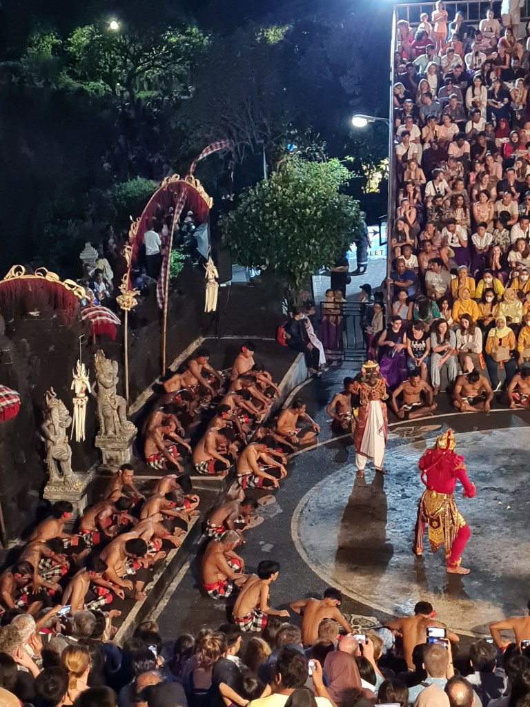 Instead of music or gamelan playing, which is a popular accompaniment to performances in Indonesia, the Kecak fire dance is accompanied by a choir of all male voices. They chant the word ‘Kecak’ over and over at different pitches and tones as the story unfolds. I won’t go into the story, but you’re given a programme that explains it all, so I was able to narrate it to the kids as the dance unfolded.