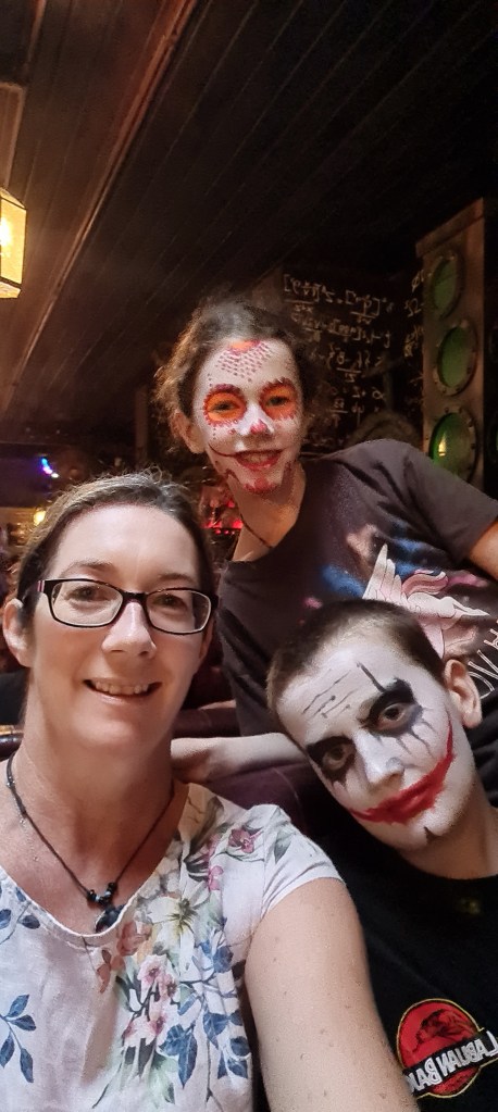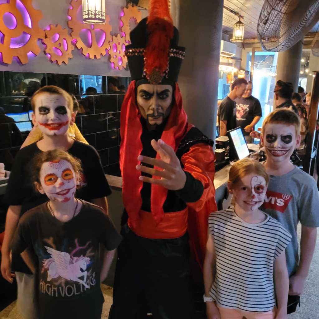 Jodie had booked us all into the Frankenstein’s Laboratory Bar for our last dinner in Bali. This place was awesome for kids (and adults!), with incredible, ghoulish face painting available and a couple of entertaining shows.