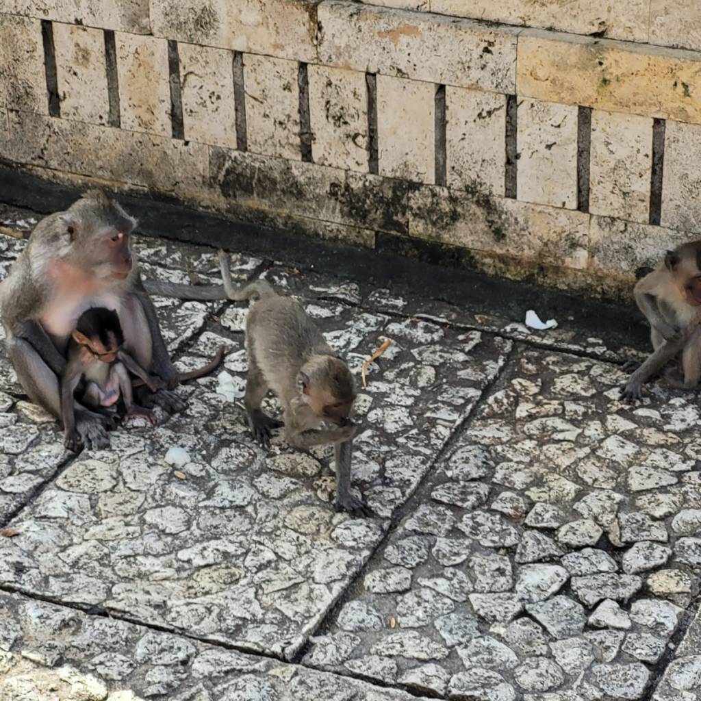True to form, as we approached the top steps, a monkey snatched a woman’s spectacles off her face! A nearby security guard quickly threw the monkey food and was able to recover them, however the next hapless victim was not so fortunate, and he lost his expensive looking sunglasses to a monkey who managed to hold onto them when food was thrown, catching it in its free hand before leaping away into a tree overhanging the cliff. Needless to say, the kids were somewhat rattled by this behaviour and were keen to scurry around the temple as quickly as possible to get away from the monkeys!