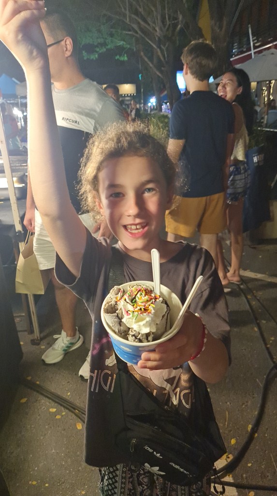 In the early evening, we headed out to the Laguna Night Market with Clare and Michel, who had booked a table at a fabulous wine bar called Drinks & Co. We both enjoyed our first proper wine in months since decent wine is so hard to come by in Southeast Asia. The kids were happy as Shaun and I took turns walking around the night market with them, buying snacks, yummy street food, trinkets, and amazing rolled ice cream.