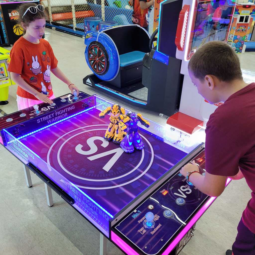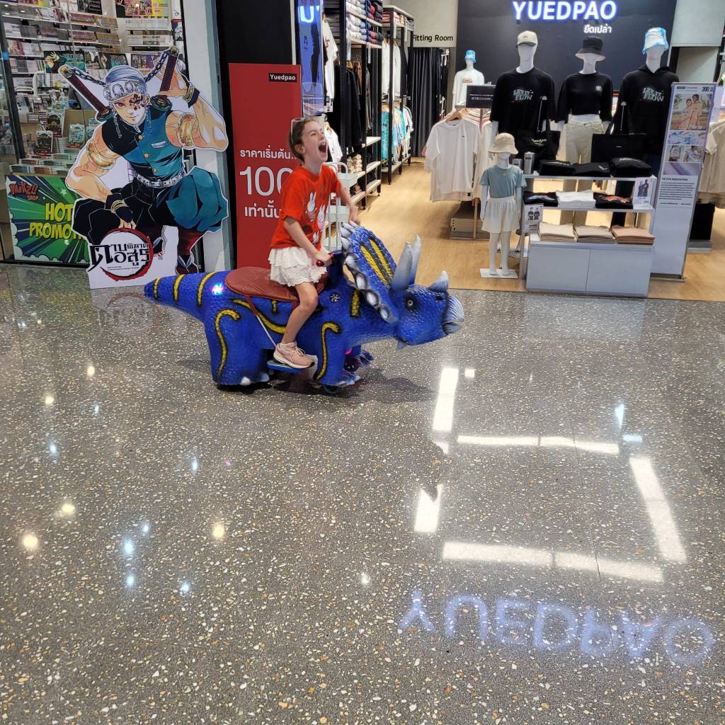 Anna had been dying to go on one of these mechanical animals that you can ride around the mall ever since she’d first laid eyes on them in Bali. She finally got her wish and was delighted with her five minute ride. They also enjoyed this robot battle game.