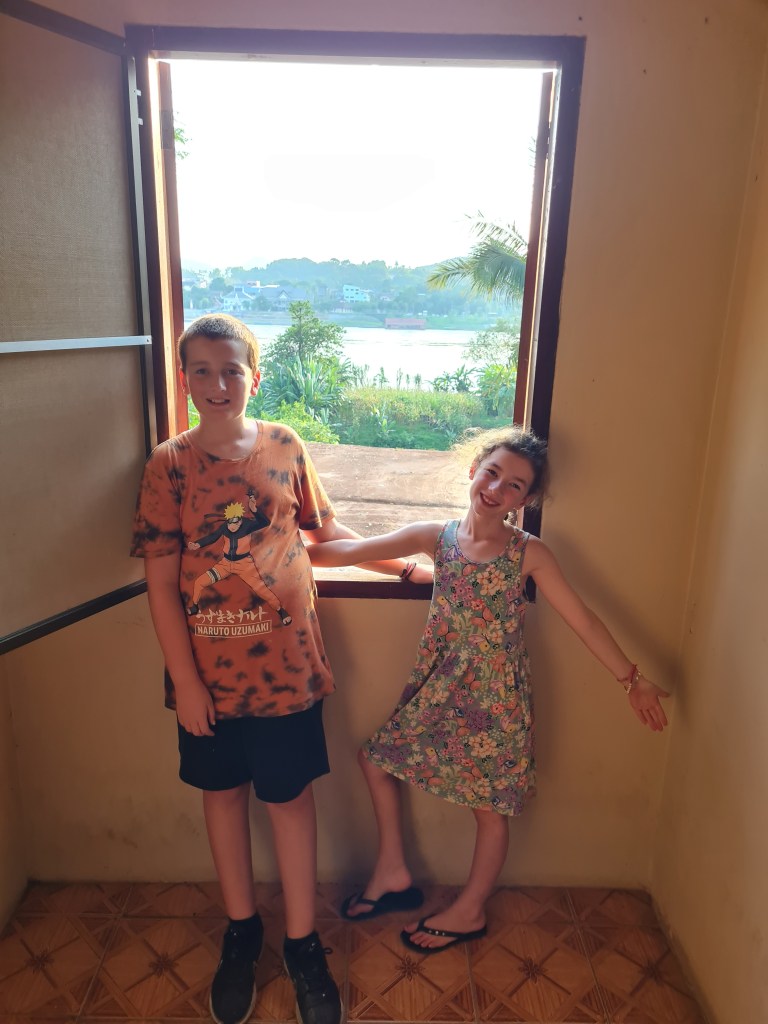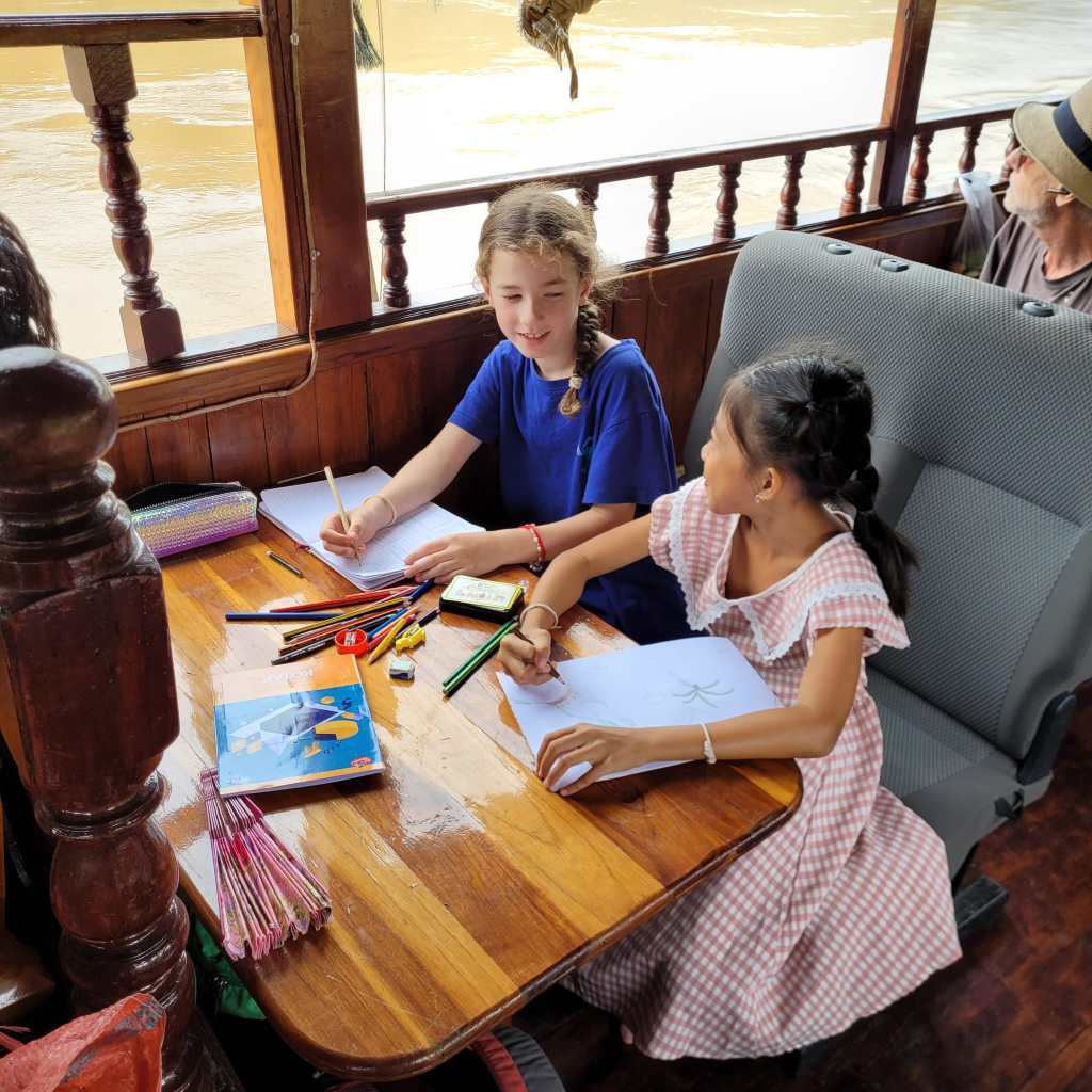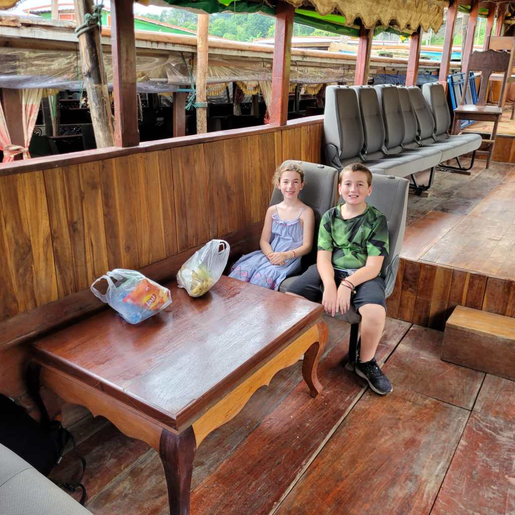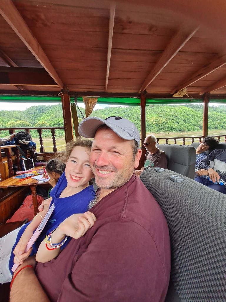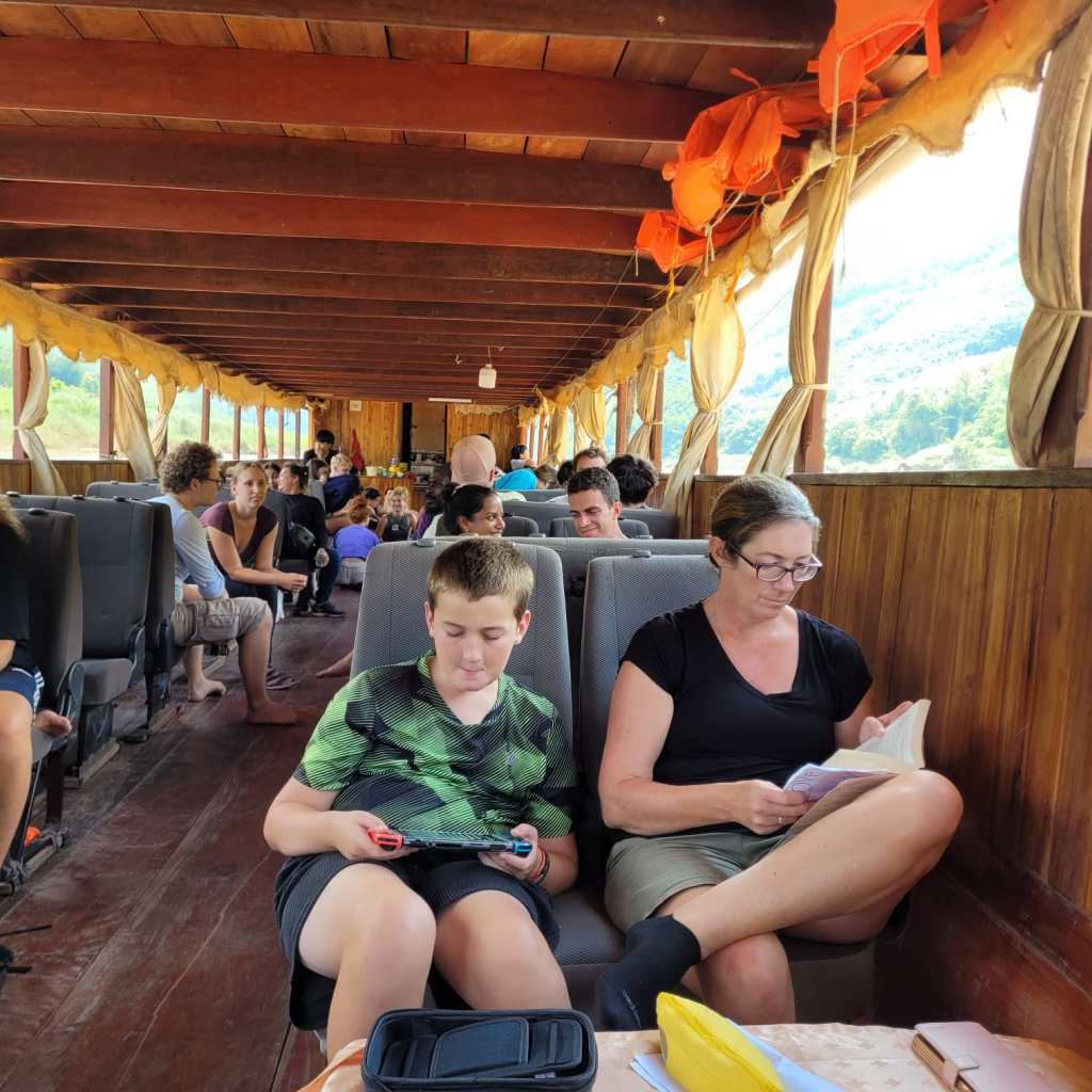 Fortunately for us, we found a shop with a sign that said it sold boat tickets. The woman fetched her brother, Mit, who spoke English and we enquired about whether we could buy tickets for all of us and somehow end up with a table on the boat as well. After a phone call to the captain of the boat that was departing the next morning, Mit said if we paid for an extra couple of seats plus a commission fee, they could arrange a table all the way to Luang Prabang. We knew a table was a key part of ensuring a successful journey with the kids so that we could play games, do some homeschooling and drawing to pass the time and be able to eat comfortably, as well as creating a bit more leg room. It was a great deal, especially considering the fact that the fancier “VIP” boats with tables cost $135USD per person, compared with the 400,000 LAK per person plus an extra million for the table (1 million kip is about $100NZD).