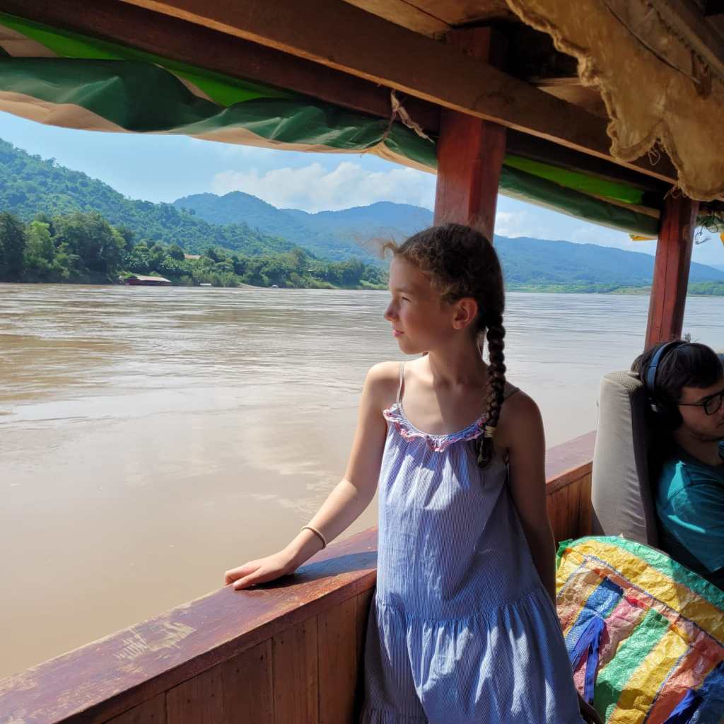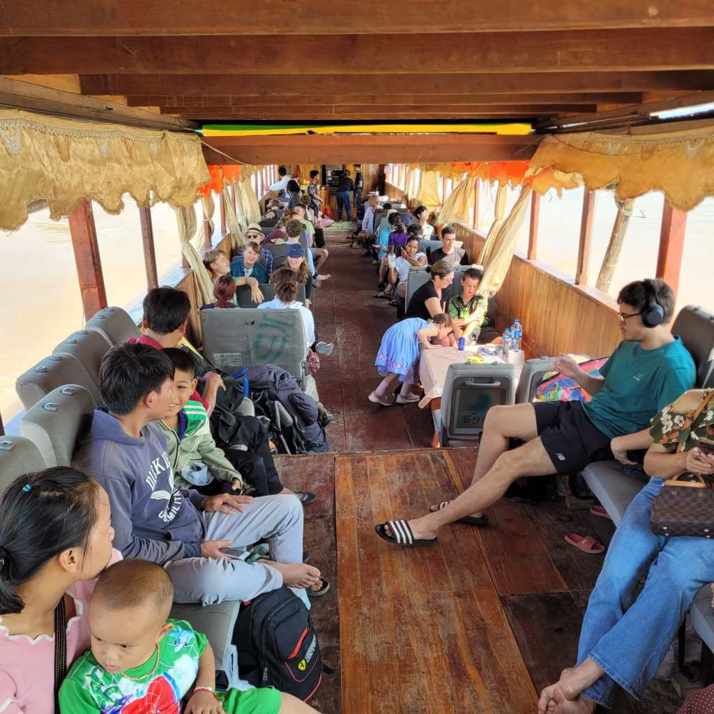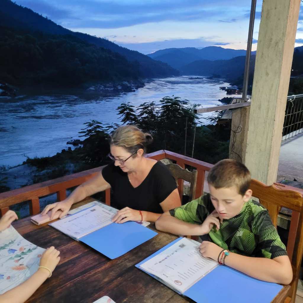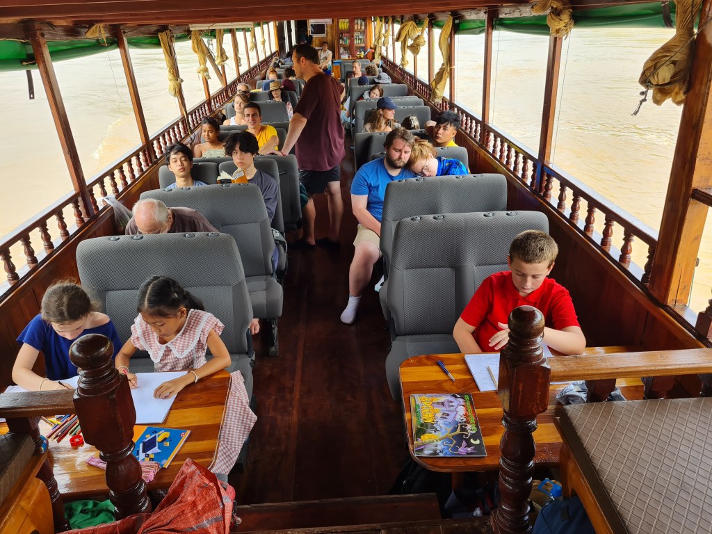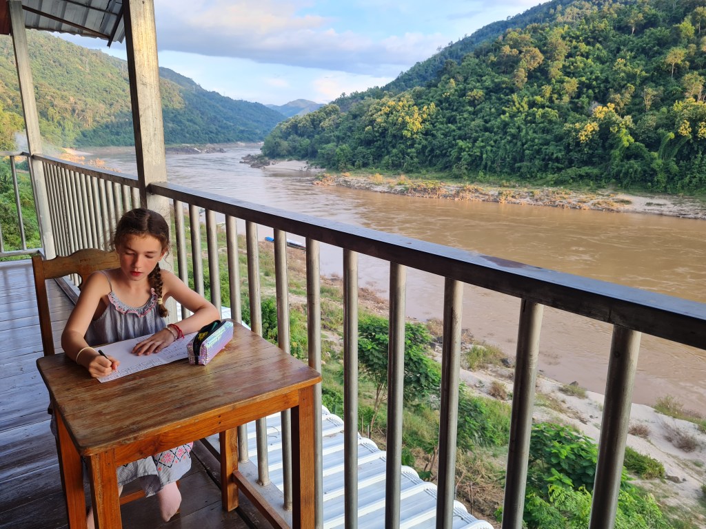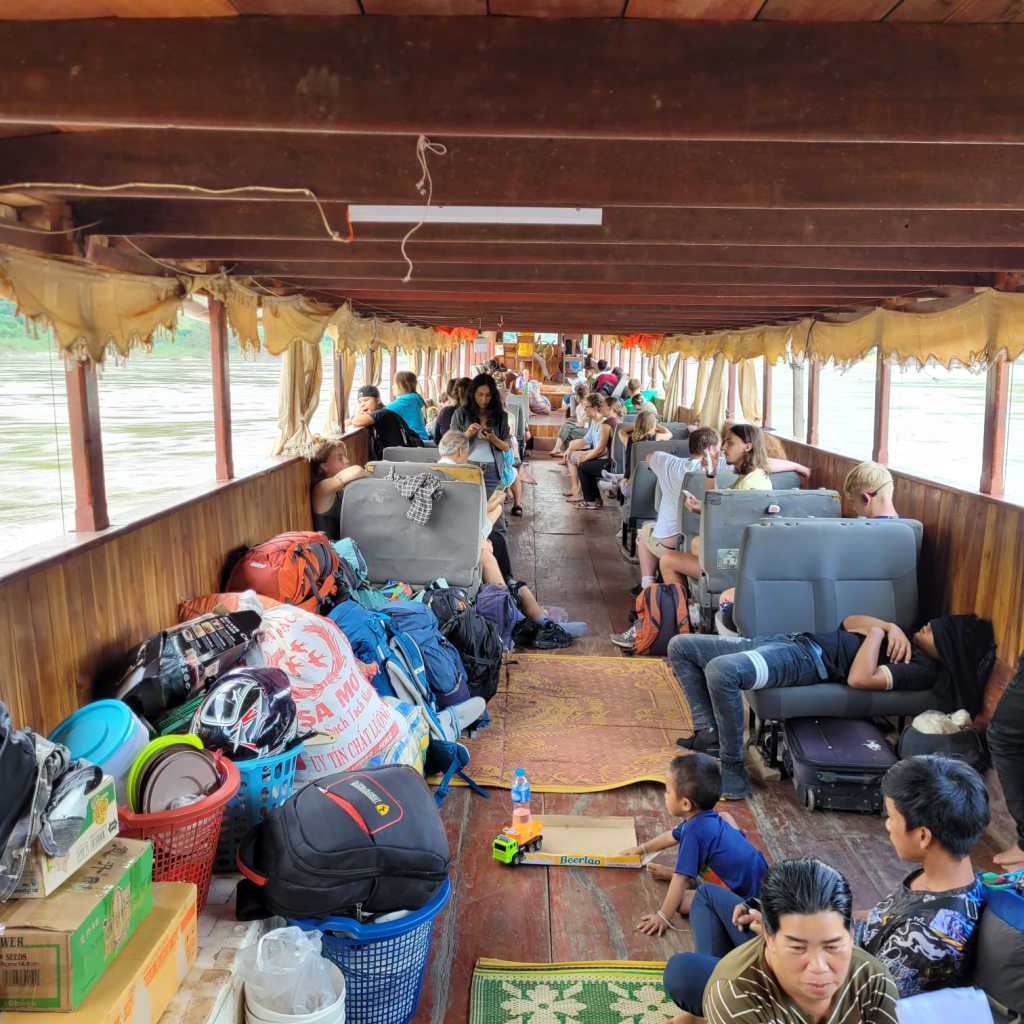 Fortunately for us, we found a shop with a sign that said it sold boat tickets. The woman fetched her brother, Mit, who spoke English and we enquired about whether we could buy tickets for all of us and somehow end up with a table on the boat as well. After a phone call to the captain of the boat that was departing the next morning, Mit said if we paid for an extra couple of seats plus a commission fee, they could arrange a table all the way to Luang Prabang. We knew a table was a key part of ensuring a successful journey with the kids so that we could play games, do some homeschooling and drawing to pass the time and be able to eat comfortably, as well as creating a bit more leg room. It was a great deal, especially considering the fact that the fancier “VIP” boats with tables cost $135USD per person, compared with the 400,000 LAK per person plus an extra million for the table (1 million kip is about $100NZD).
