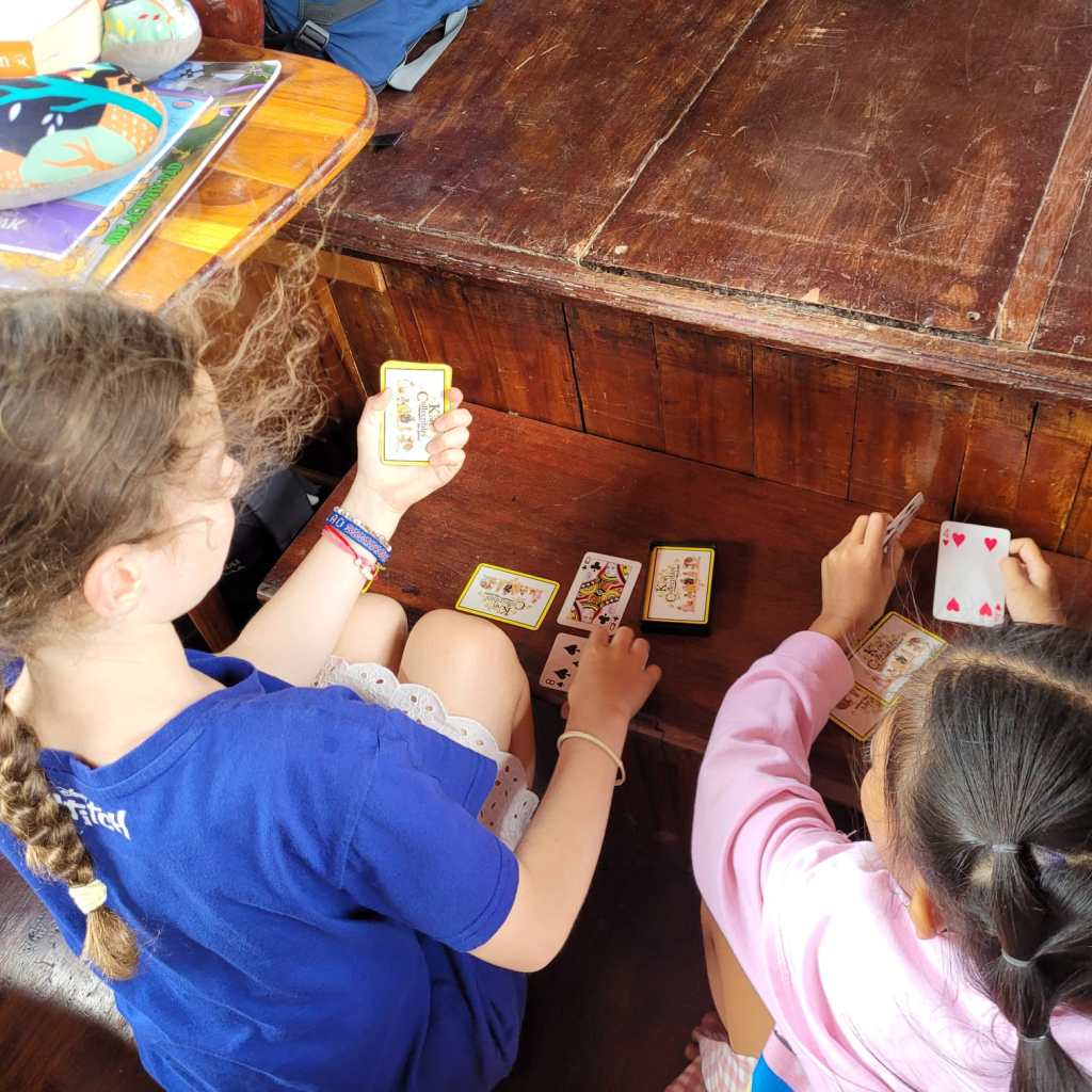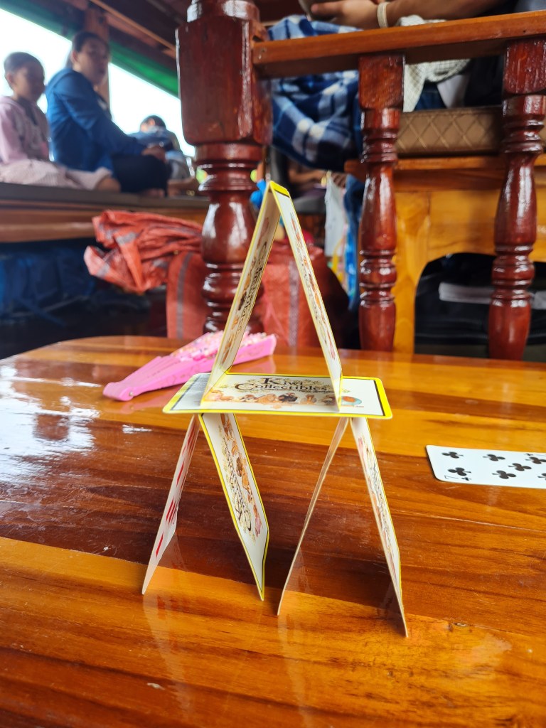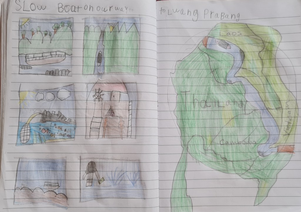 Anna got to work on building card houses and was very pleased to create this one until the rocking boat put an end to this activity. After that, it was time for some visual diary work for Anna, while I did some maths with Leo. I noticed while sitting next to Leo that a young local girl on board with her mother was looking wistfully at Anna’s pencils, so I invited her to sit by Anna and draw on some paper we found in Anna’s book. She shyly accepted, and it was lovely to see a wordless friendship blossom between her and Anna for the rest of the boat journey.