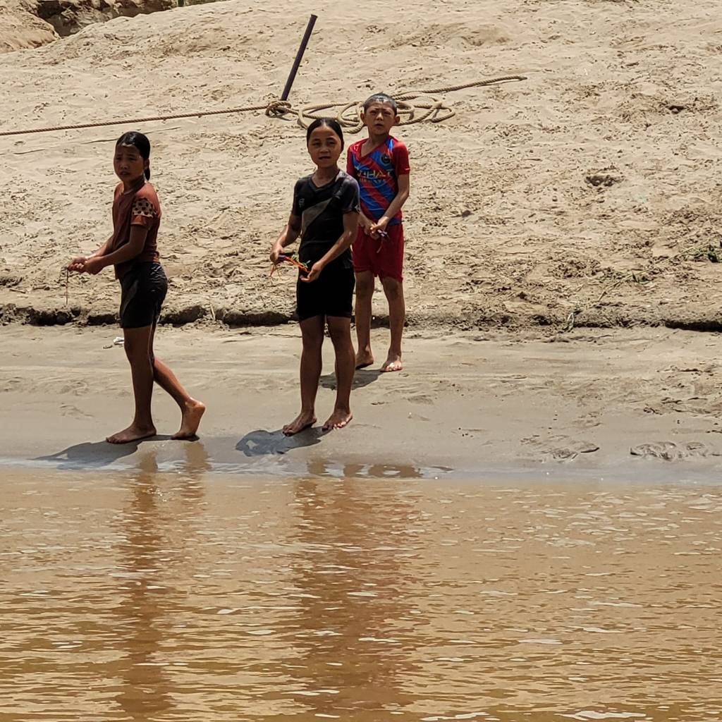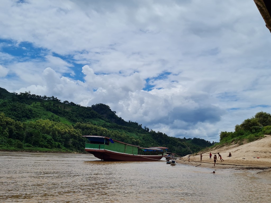 As we made our way further down the Mekong, we passed lots of other boats and local villages, stopping at some of these to pick up/drop off people. At one such stop, a group of three kids boarded the boat, sidling along the outside of the boat like a trio of cute little pirates, offering wristbands for sale for 10,000LAK each ($1NZ). Admiring their entrepreneurship, Shaun bought five, although at that moment, the captain’s wife started yelling at them to get off as the boat was pulling away. Suddenly, all three of them leapt off the boat in complete synchronization, and swam like mad to the safety of the river bank.