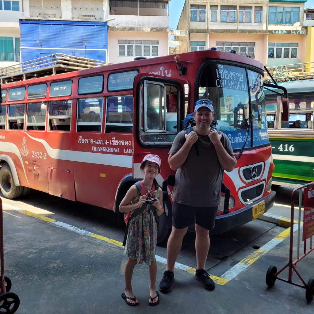 We arrived at the Chiang Rai bus station around midday, leaving us plenty of time to try and find a few more US dollars (rare as hens’ teeth in this part of the world) from the local currency exchange places, and pay a final visit to the beloved 7-Eleven for a ham and cheese toasted sandwich. Anna also took it upon herself to use all her minion stamps (a type of discount coupon) towards buying a pack of grape Hi-Chews with her pocket money. Usually 20 baht, Anna was utterly delighted to discover that her combined minion stamps meant that she only had to pay 3 baht for her Hi-Chews!
