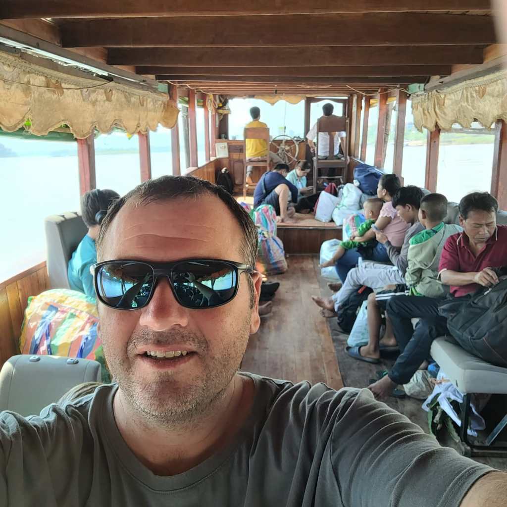 After a good night’s sleep, we were ready to board the next boat at 8am the next day, finding two tables with seats on either side this time…it was very posh, and exactly the same set up as the fancier, more expensive boats. As we were boarding, the captain’s wife was at the door, greeting us and telling us to take off our shoes and put them in the plastic bags she was handing out. Once we got inside, we could see why, as this boat had beautiful wooden floors and was very clean. Clearly, this matriarch was very houseproud! When some young backpackers got on with their large box of Beer Laos and a bag of ice, she swiftly provided them with a large steel bowl to avoid her clean floor getting wet.