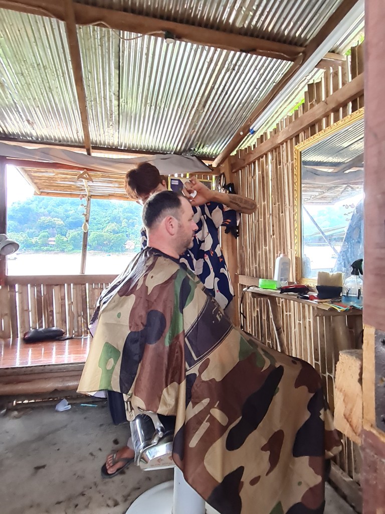 We stumbled across a barber’s shack on the riverbank during our walk, where we stopped since Leo and Shaun both needed haircuts.