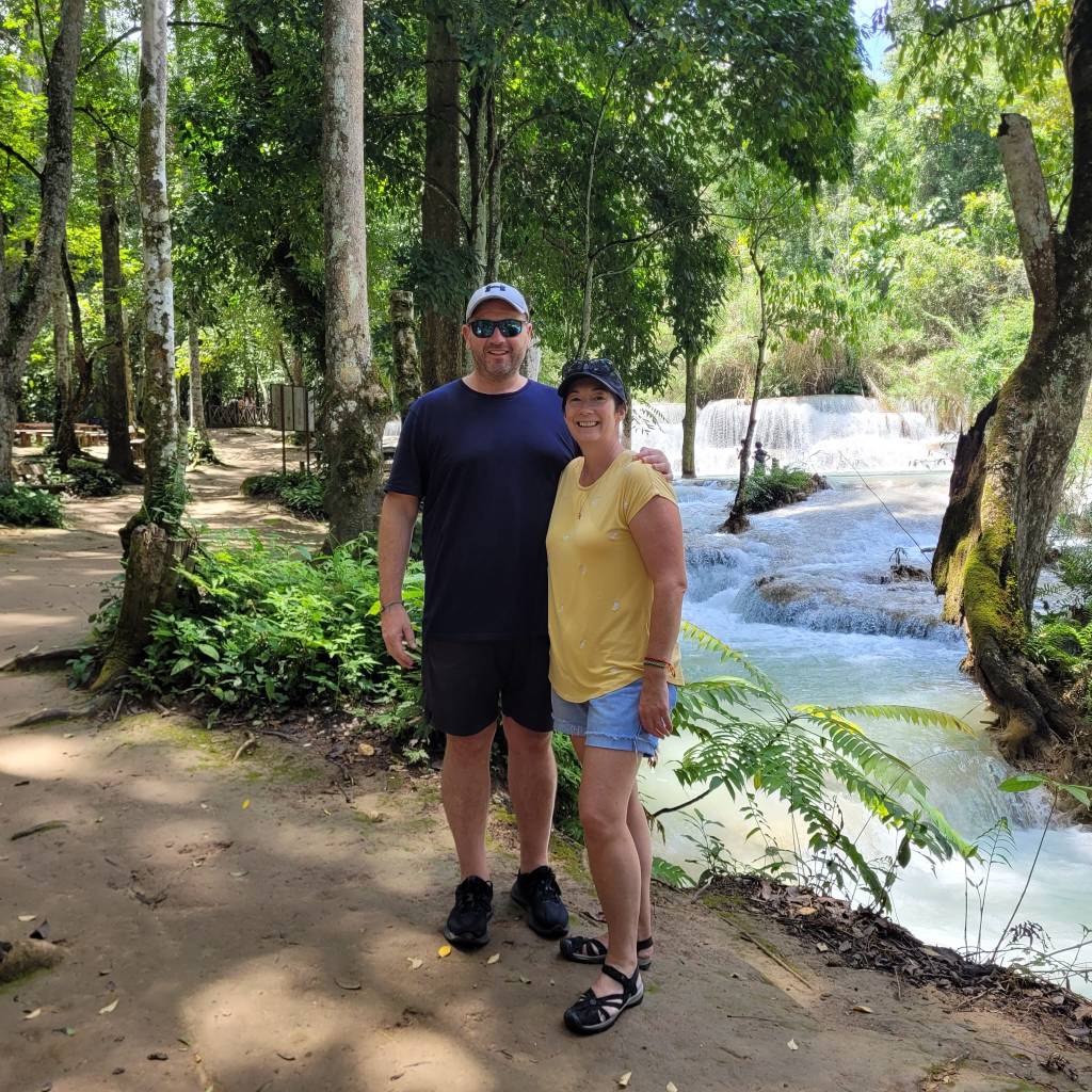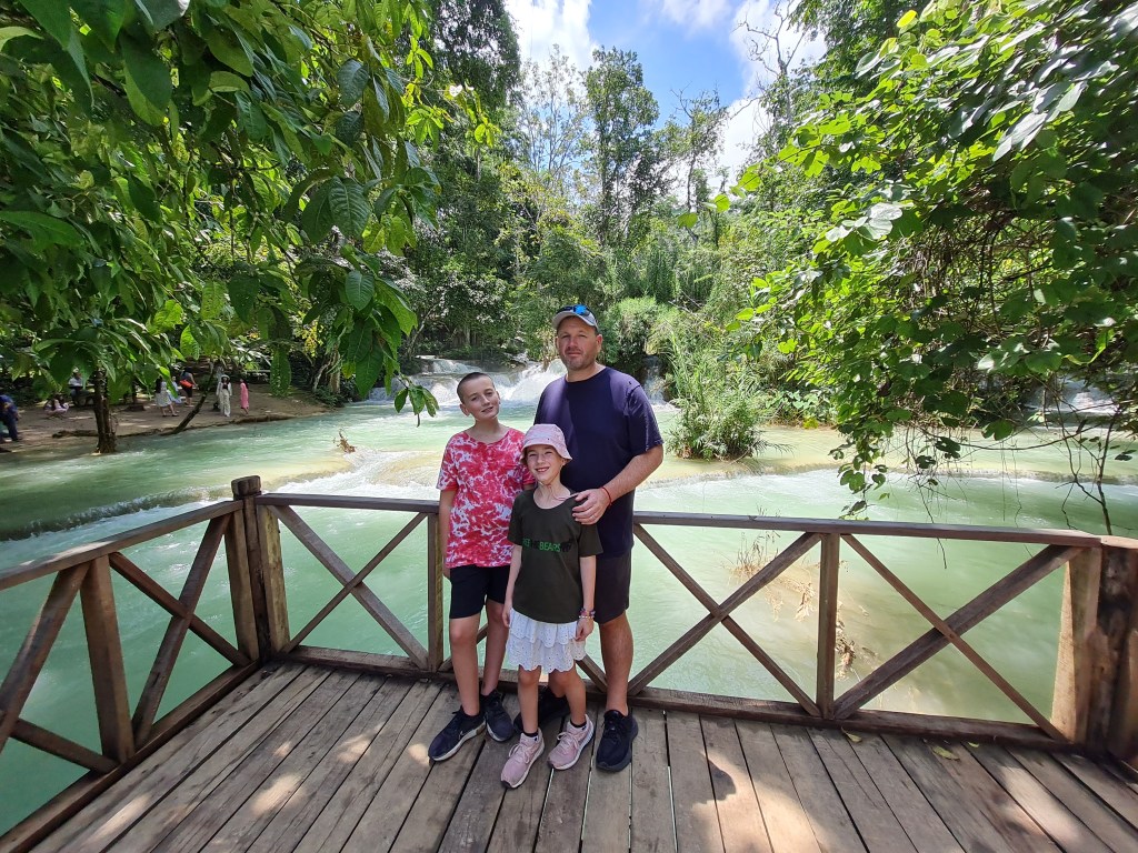 Upon arrival, we paid our 30,000kip entry fee (once again, the baby was free!) and hopped into an awaiting electric golf buggy to take us up the hill to the start of the waterfall trail.