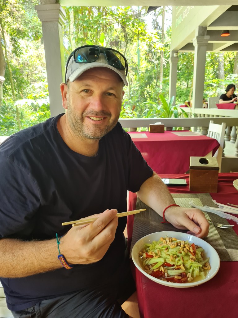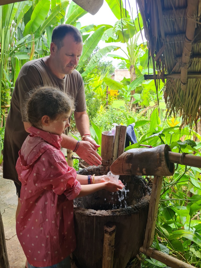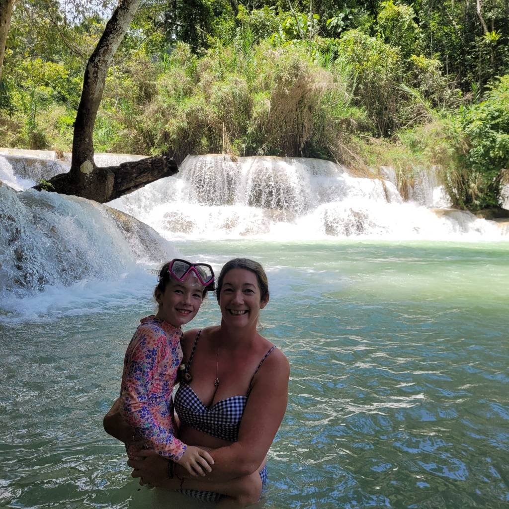 After a few minutes, I ducked down, so we were both immersed up to our chest, but Anna was not happy! She wanted to stay in my arms, but as I was being nipped at by tiny carnivorous fish (you know the spa fish?) that seem to be everywhere in Southeast Asia, I was keen to get off my feet and get moving. I persuaded her to swim back to the steps while I swam over to the waterfall, getting a sense of its thunderous energy and lovely cooling spray on my face. This pleasant feeling would last a couple of hours – it was wonderful!