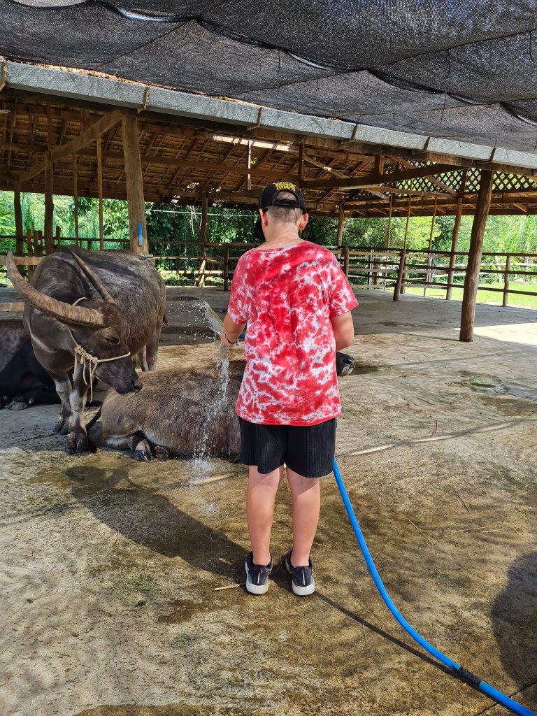 Mum milked the buffalo because she has milked a cow before, but I decided not to because its teat reminded me of a penis! We then bathed and brushed the buffaloes called Louis and Lana. One buffalo was just sitting in a mud bath that would be like a spa pool because of the sun. After that, we fed them and the calves with the same grass as before.