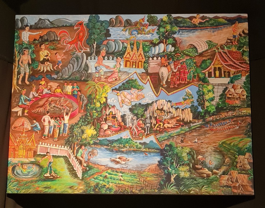 The image above was painted by a local artist and illustrates key parts of the different stories. We learnt about some of the antics of the trickster Xieng Mieng; the legends of how the Mekong and Nam Khan rivers came to be homes for two of the three Nagas, or water serpents, who were quarreling; how Mt Phousi came to be in the middle of Luang Prabang – it was cut off the top of a mountain in Sri Lanka by the Monkey King so the Queen could have her choice of mushrooms growing there; and how surrounding hills or other landscape features were created. This was proper storytelling theater, and both kids (and us!) were entranced by his use of voice, dramatic pauses, gestures, and music that wove the tales together. If you’re ever in Luang Prabang, it’s worth a visit.