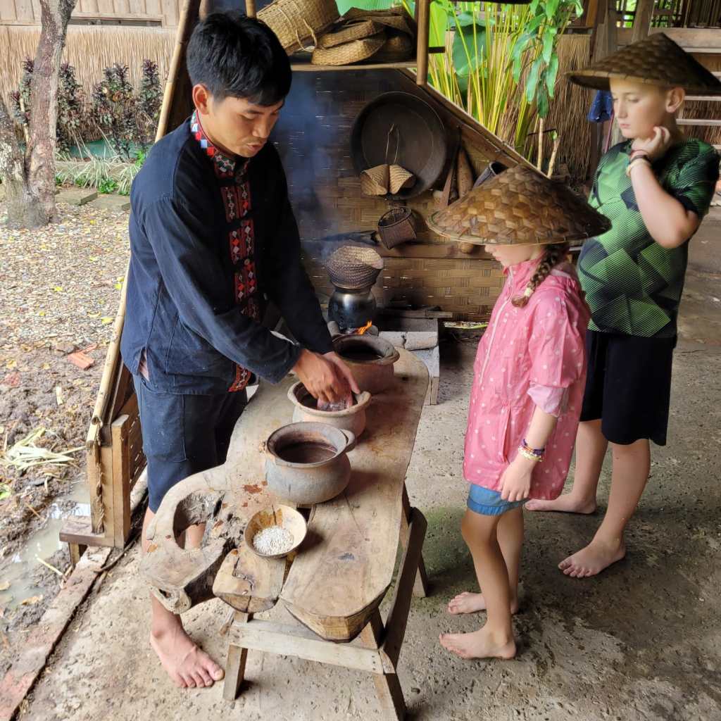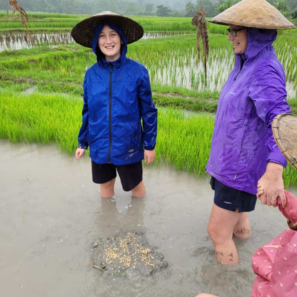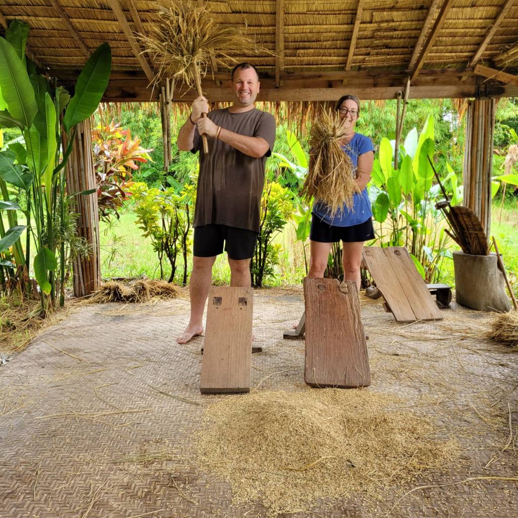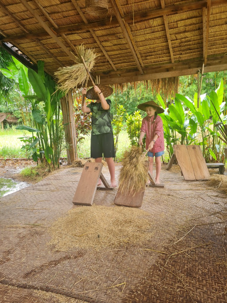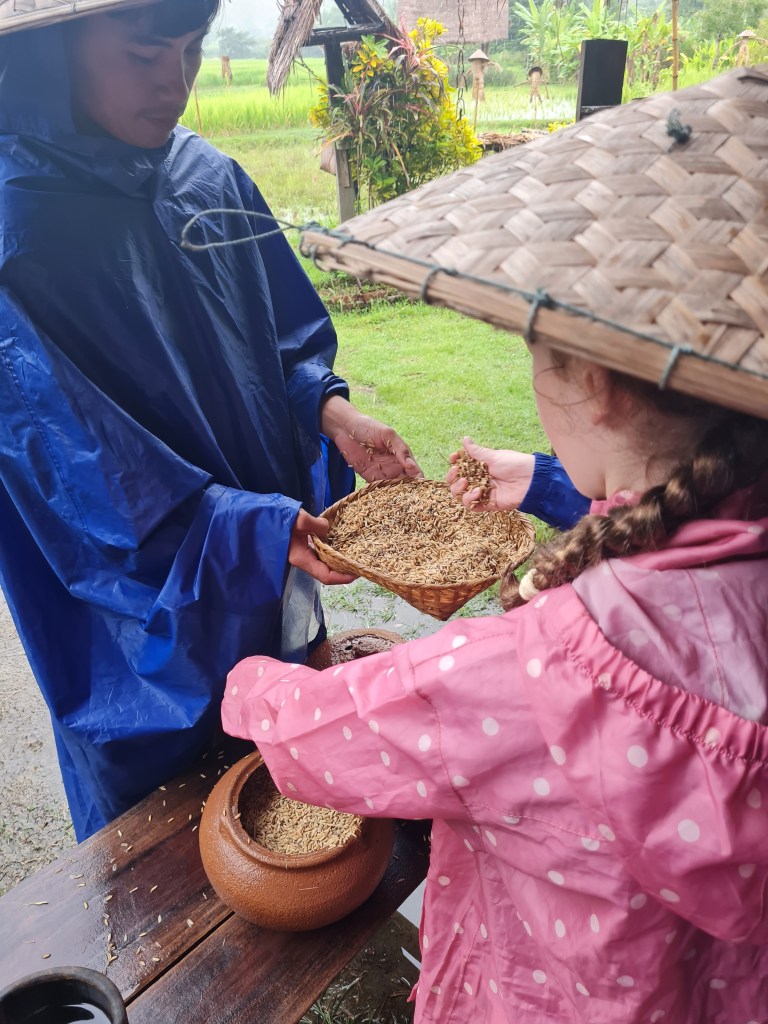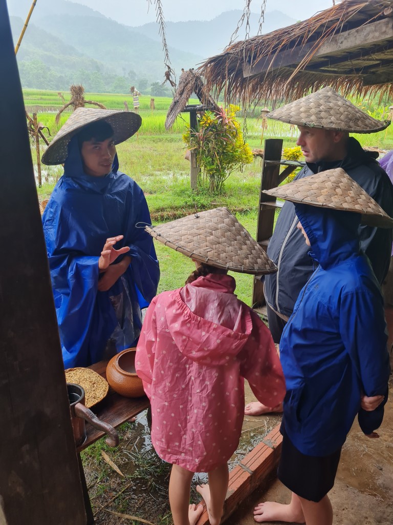 We were keen to do some more educational activities and had heard good things about the Living Land Farm, which is a community enterprise growing organic rice, salad greens, herbs, and vegetables to benefit local people. They also teach English to local children, running evening English classes, and all the profits from visitors are used to support the local community, sending children from poorer families to school and supporting their education right through to university. You can do homestays and volunteer there, or you can just visit for a morning or afternoon like we did. Our guide for our morning of learning how to farm rice, Kham, was put through school and university by the collective. As a child, he was a monk for several years (many young boys in Laos are monks for some of their childhood, especially those from poorer families, as the children will always be well fed and cared for in a monastery, and it is the familys way of ‘making merit’ in the Buddhist tradition). Kham has now returned to work at the farm as an educator and tour guide.