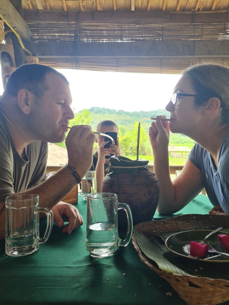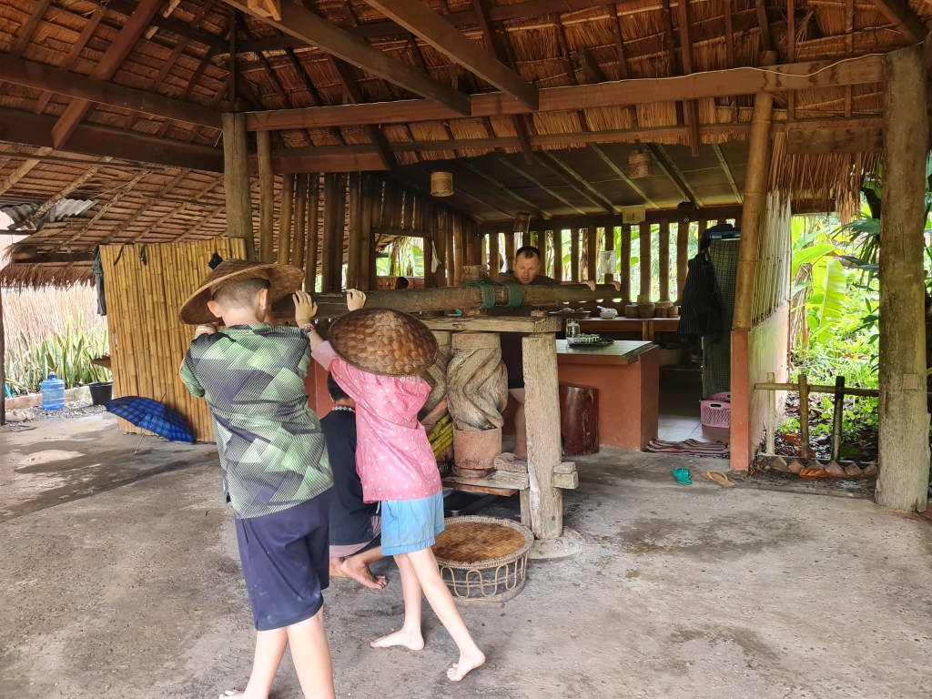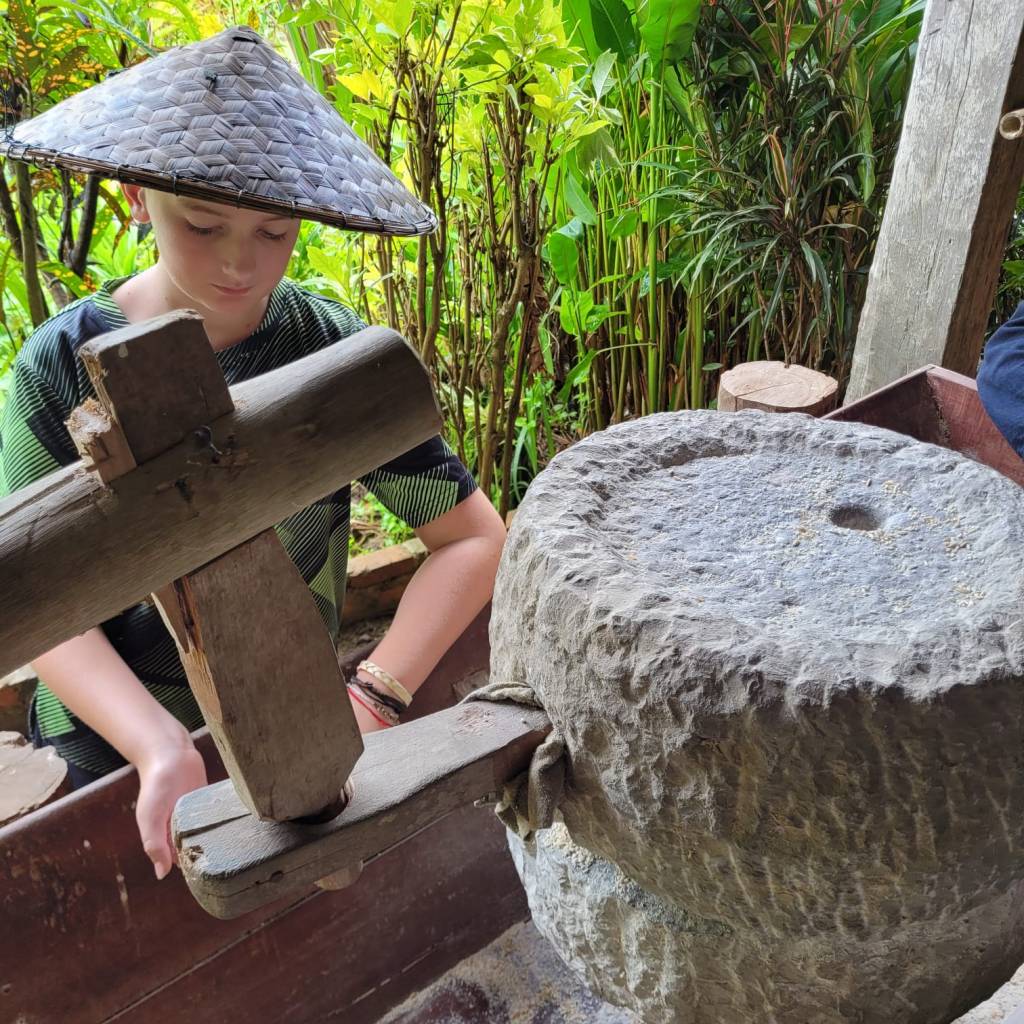Just before we ate the rice, we pushed a plank around in circles to crush the sugarcane and get the juice out. After this we drank the juice, and it was very nice. It didn’t taste like straight sugar it tasted more like a natural soft drink.