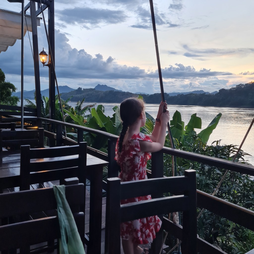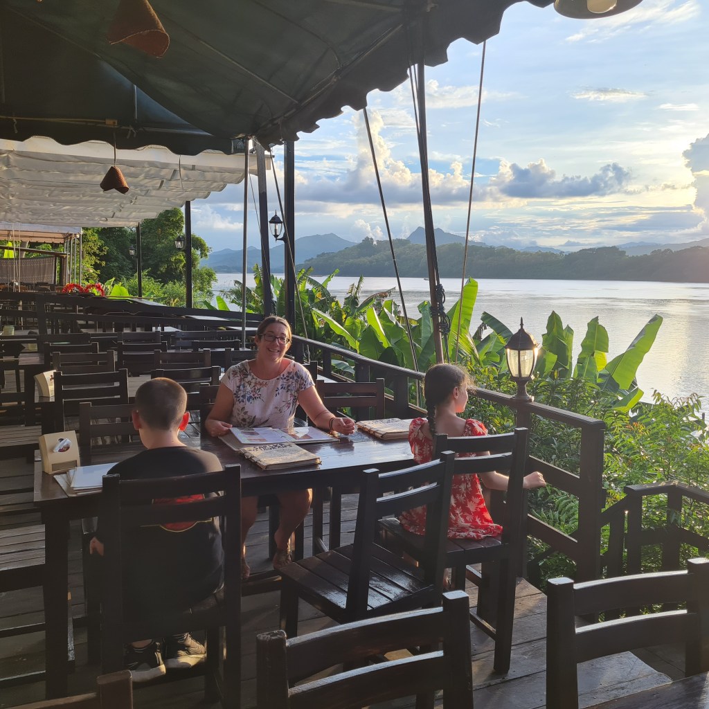 We decided to have a sunset dinner on the bank of Mekong for our last meal in Luang Prabang and found a local restaurant near our hotel that served reasonably priced food. It turned out to be delicious food as well and we all enjoyed watching the sun dropping down behind the hills as we ate.