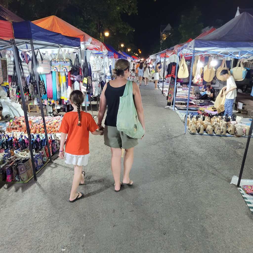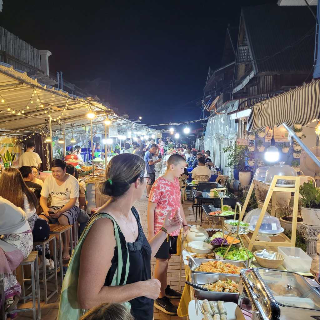 Just as we were leaving, we bumped into our Austrian backpacker friends for the third time that week, and enjoyed a quick update on their activities. This was the same couple who had warned us about taking the boat when we were getting off the bus at the Thai-Laos border. They had caught the overnight bus from Huay Xay, and the first time we saw them was at the storytelling the day they arrived. We ended up chatting with them for ages after the show finished, comparing notes on our respective journeys. We then saw them again at the local carnival the night before. By the time we saw them at the palace, it was like catching up with old friends! It’s so interesting how travel breaks down the usual barriers. After wishing them well on their journey, we returned to Villa Pumalin to shower and enjoy the air-con for a bit before heading out for dinner.