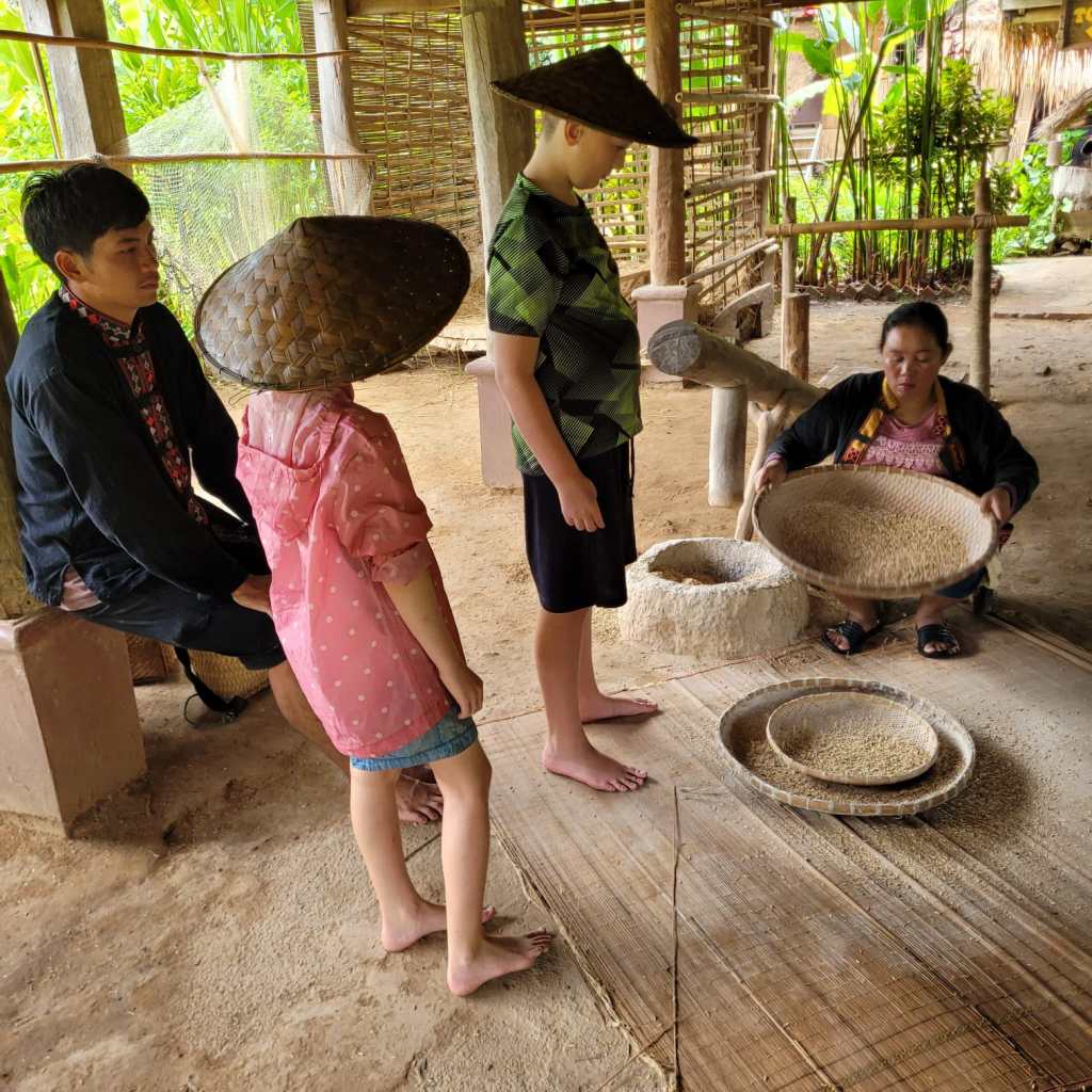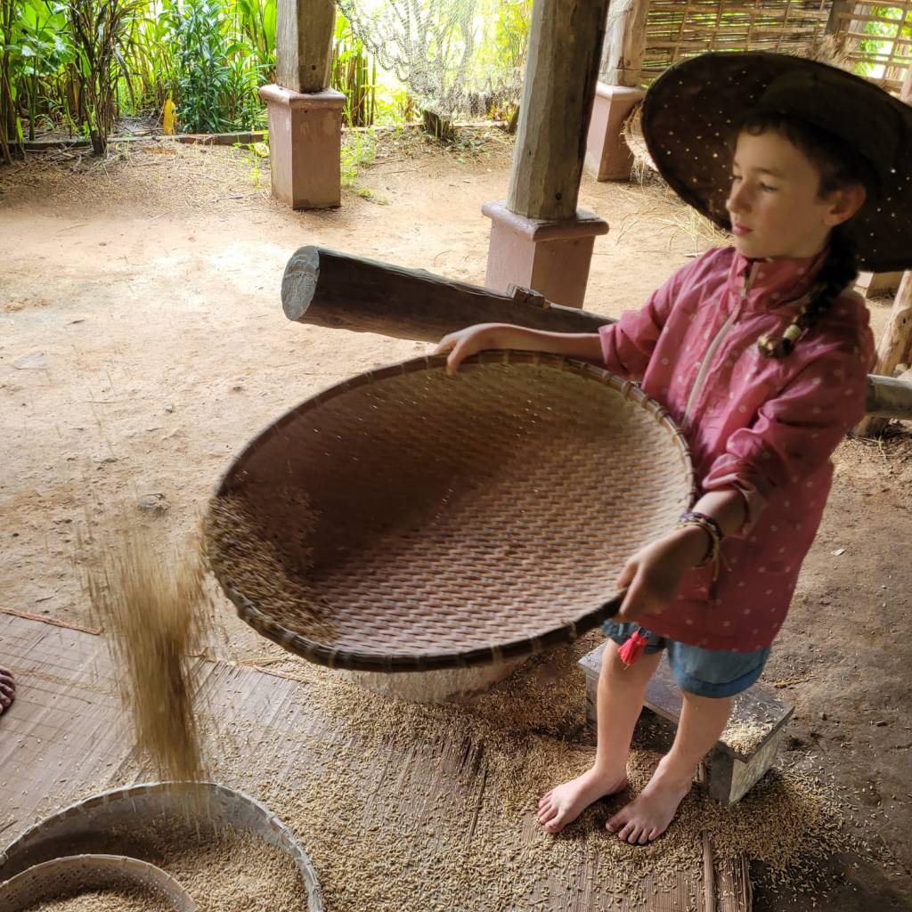 The reason I said a woman specifically is because in Laos with its traditional gender roles, they need to know this job if they want to get married. What they do is they put the crushed grains on a plate and sieve the shells out only having the rice left.