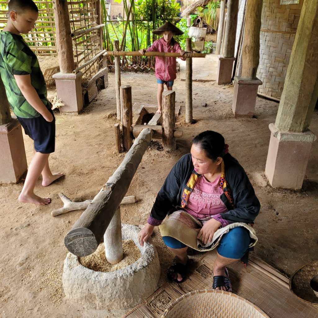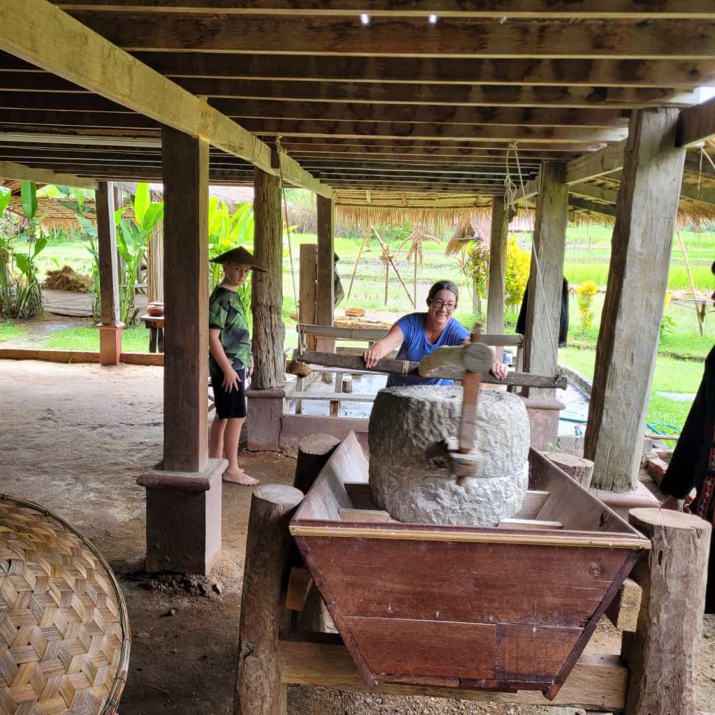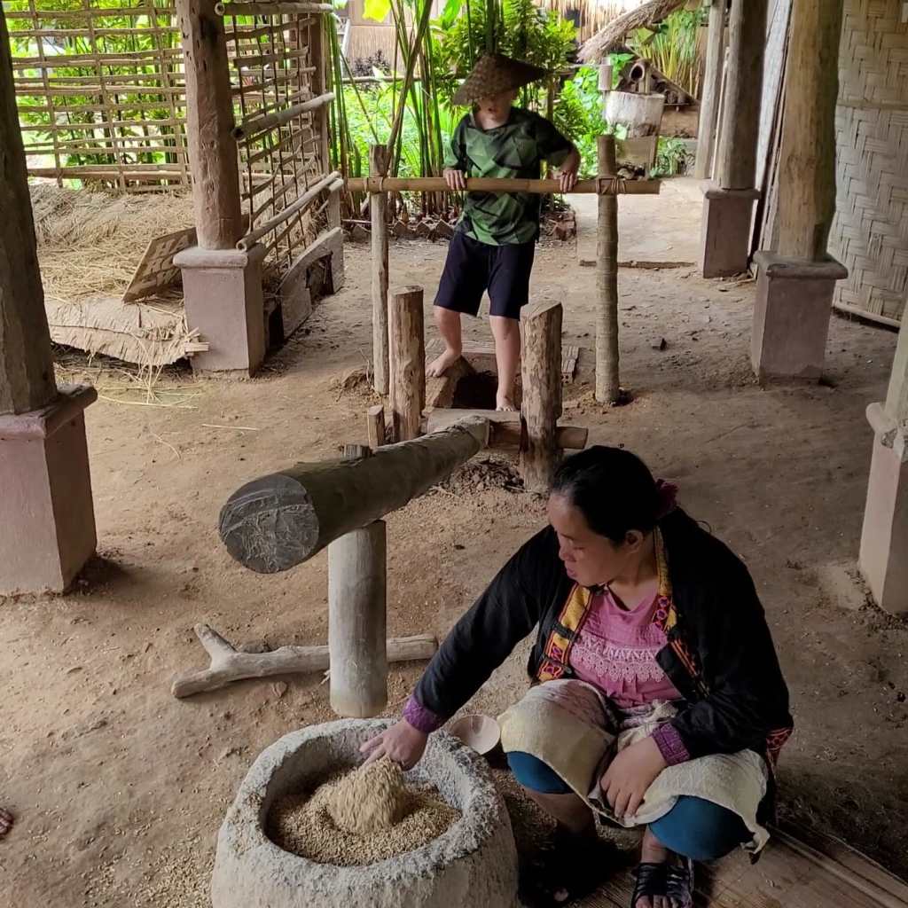 To get the grains, you need to use a pedal mechanism where you stand on and off it to crush the grains while a woman moves the rice around.