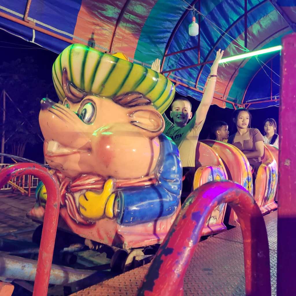Leo chose to go on the ‘Funny Mousee’ ride, which was an ancient looking rollercoaster with fairly dicey headroom, but he had his heart set on it, so he paid his $1 entry fee and off he went. He was probably the maximum height for the ride and said he had to duck when going under the downwards track because it looked a little too close for comfort.