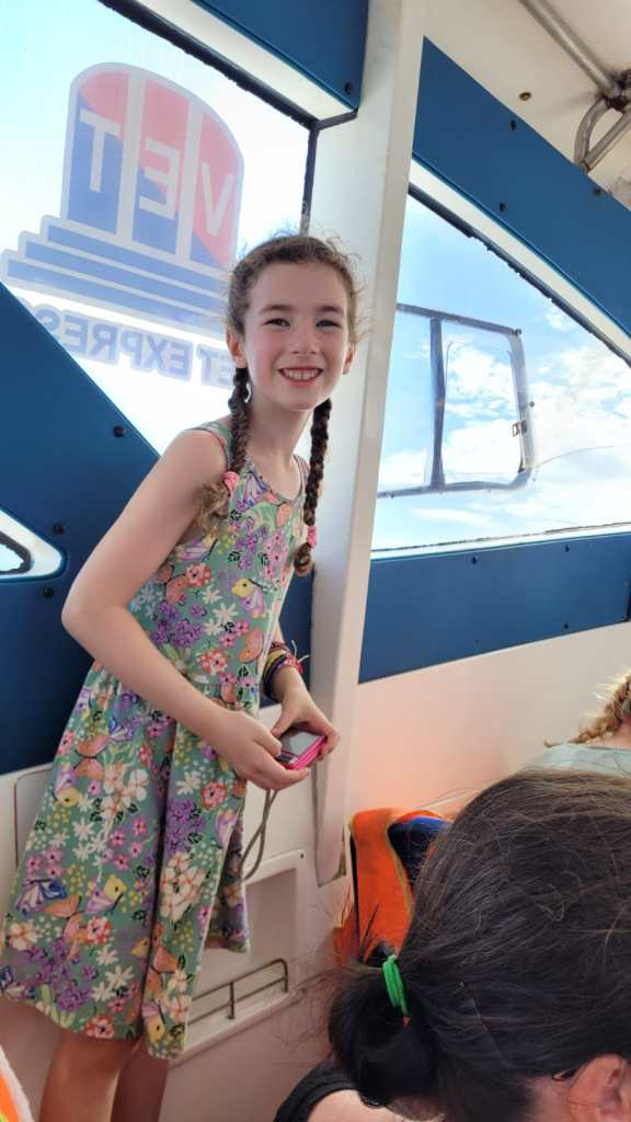 It was a traditional style boat, lit up with colourful lights that we could see from the other end of the pier. We found life jackets for everyone, including kids’ size jackets, which is rare in this part of the world.
