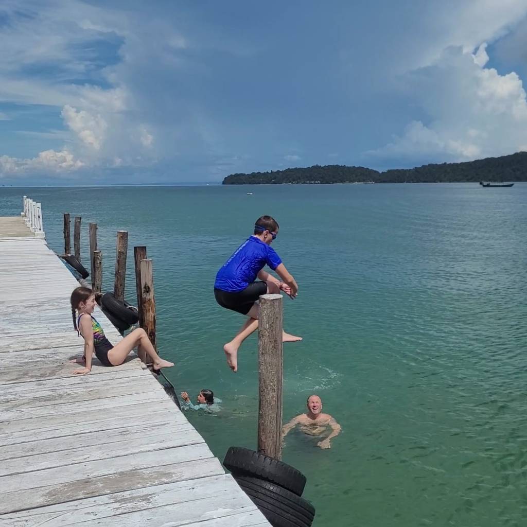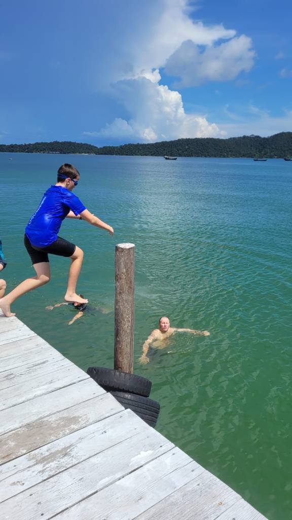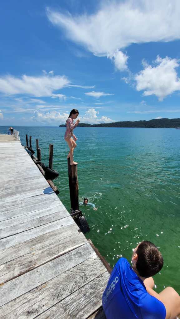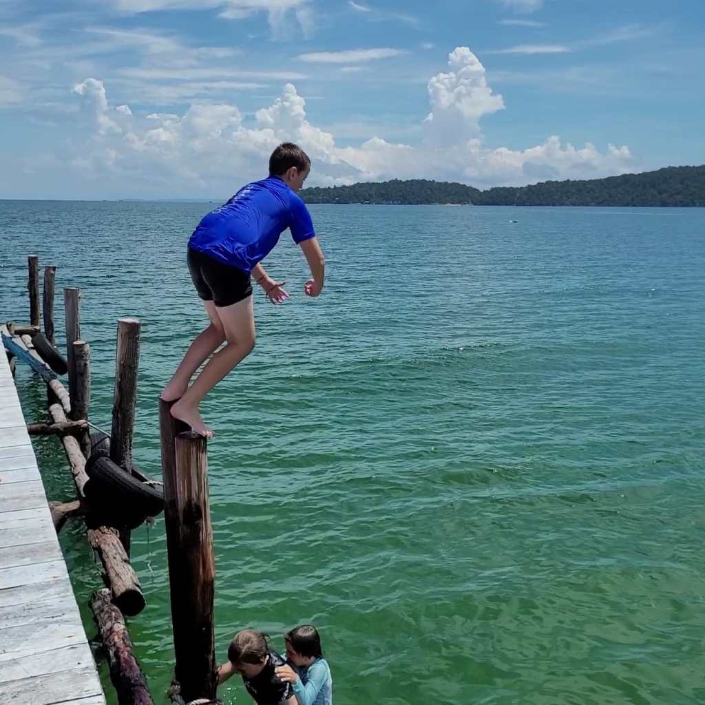 They were adventurous kids, and since jumping in the pool wasn’t really allowed, they went down to the end of the pier to jump off. As soon as Leo and Anna got wind of this, they were keen to join in, so we went to the end of the pier to supervise.