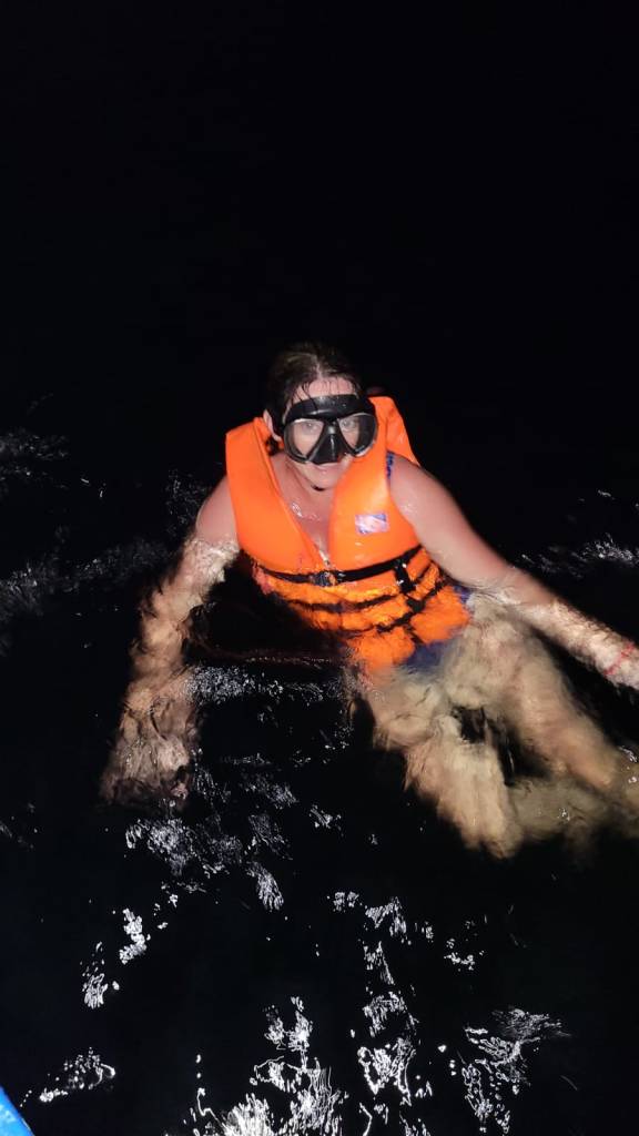 The kids protested about wearing them in the water, but when I explained that they would be swimming in pitch darkness, so needed the jacket on to be visible, they could see the logic, even though it meant we couldn’t dive down easily.