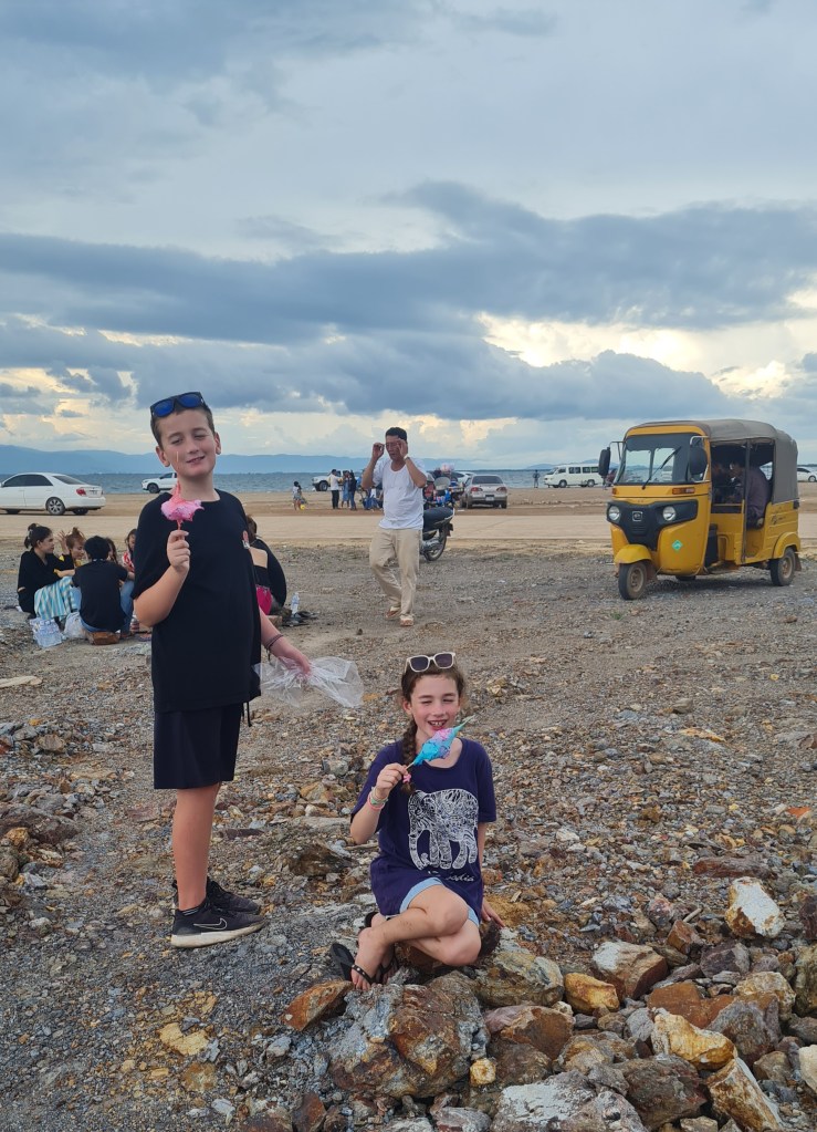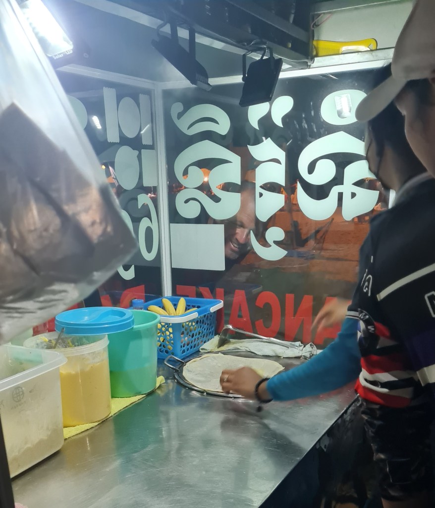 This was the first time that we had ridden scooters at night, but the roads in Kep are new and wide, so it was fine. It got a little hectic around Kep Beach as the Pchum Ben festivities continued, so we parked up for a wee stop on the beach to enjoy a crispy roti pancake drizzled with condensed milk before making our way back to the Lodge.