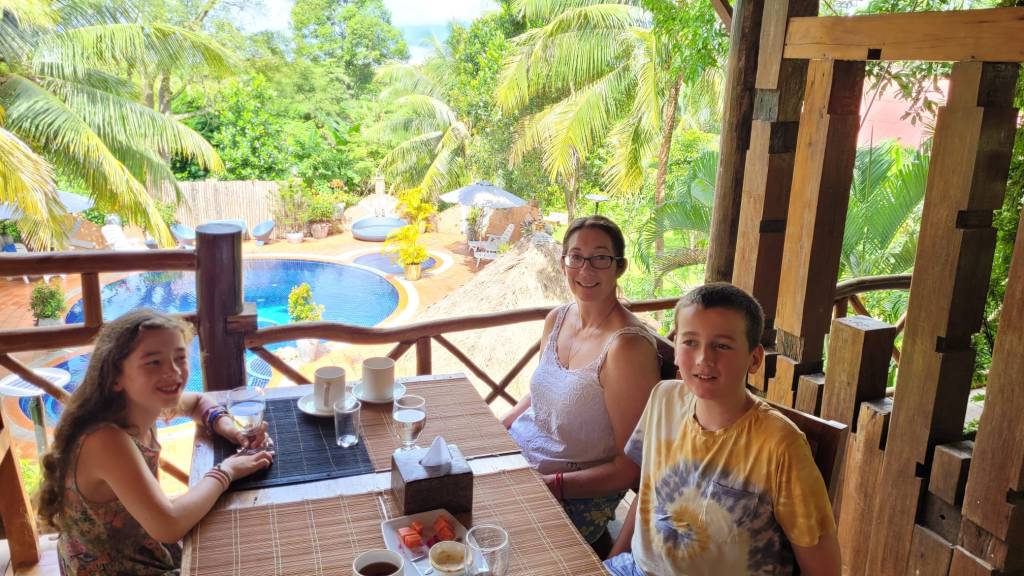 Having arrived in the dark the night before, when we awoke to see our beautiful surroundings at Kep Lodge the next morning, we were delighted! It is adjacent to Kep National Park and is an idyllic spot, with a gorgeous swimming pool as well, all for about NZ$60 a night for a family room. We were even treated to sightings of red squirrels running across the roof of the breakfast area when we were swimming in the pool.
