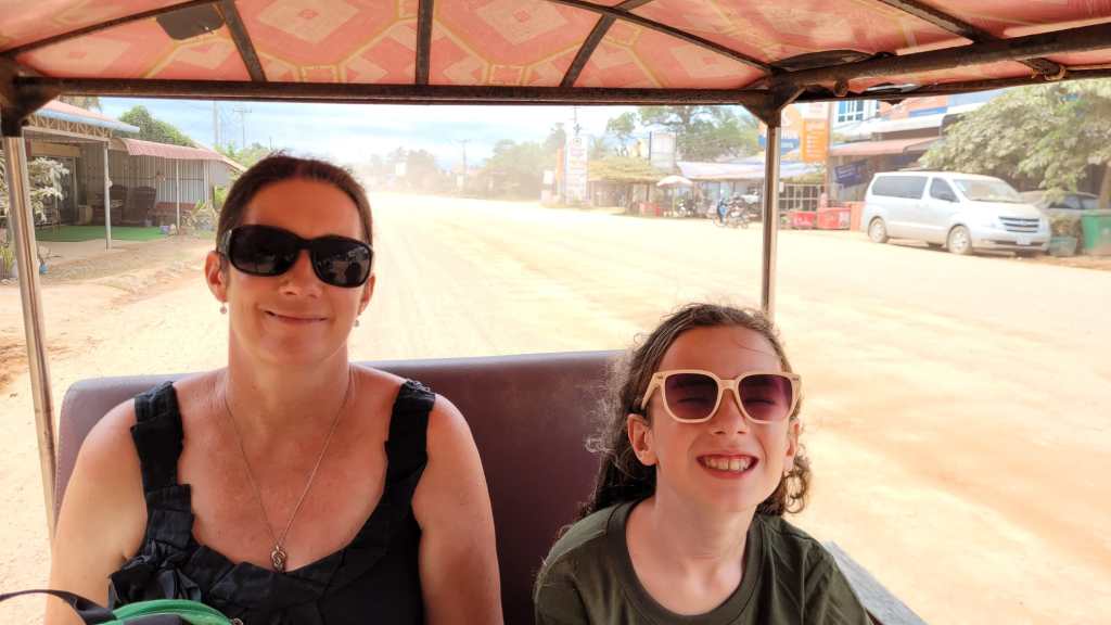 After thanking our host, we made our way to Kampot in the tuktuk. When we had travelled this road in the dark on our way to Kep two days earlier, we hadn’t seen the condition of it, although it had felt a lot better than the road between Sihanoukville and Kampot. As with the road to the pepper farm, it was unsealed and incredibly dusty. Leo’s pale t-shirt had streaks of red dust on it, and Anna’s white skirt had become a pinky colour instead.