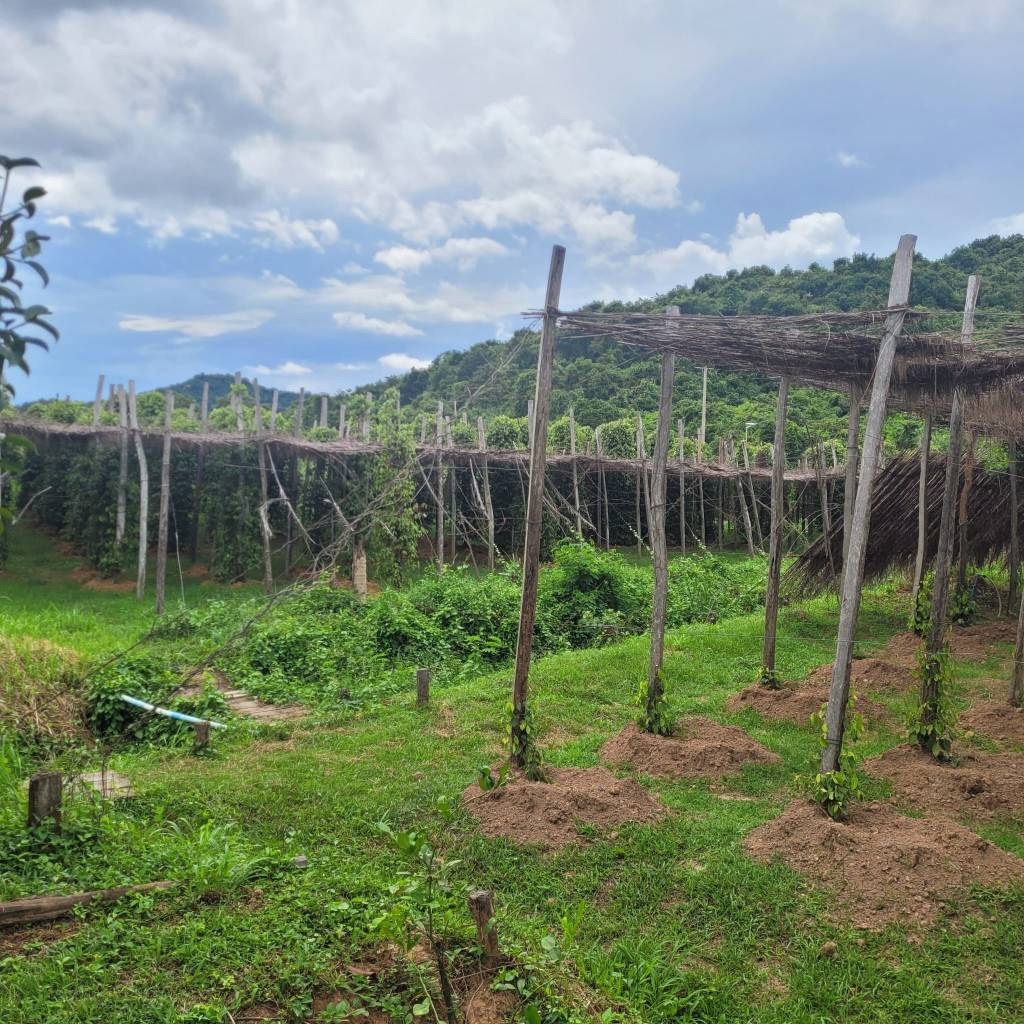 The following day, we had arranged for a tuktuk driver to take us to Sothys’s Pepper Farm for a tour before going into Kampot for the afternoon. We were picked up at 12pm, and it took about an hour to reach the pepper farm. As soon as we got to the outskirts of Kep, we saw that the roads were unsealed, and they stayed that way for the rest of the journey, becoming more rutted and full of potholes as we neared the pepper farm. Clouds of red dust swirled around us as cars passed by, save for some stretches of road where the ground had been sprayed with water outside local businesses.