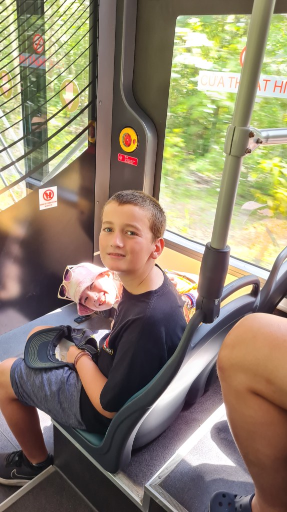 After an early breakfast the next day of amazing beef pho, eggs, bread, and roasted potatoes, we were off on the free Vinbus across the island for our epic day out.