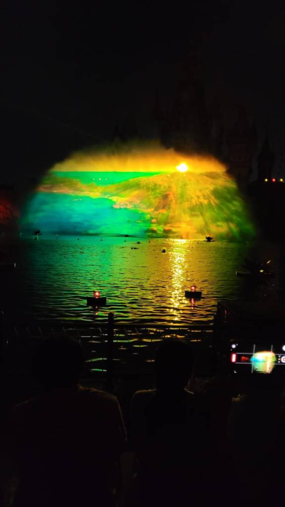Sometimes, they even sprayed water and projected videos onto the water. It was incredible from start to finish, and at the end, there was a big battle. It also had good songs in English.