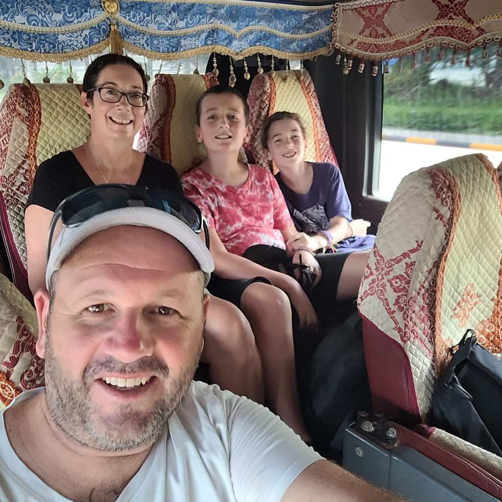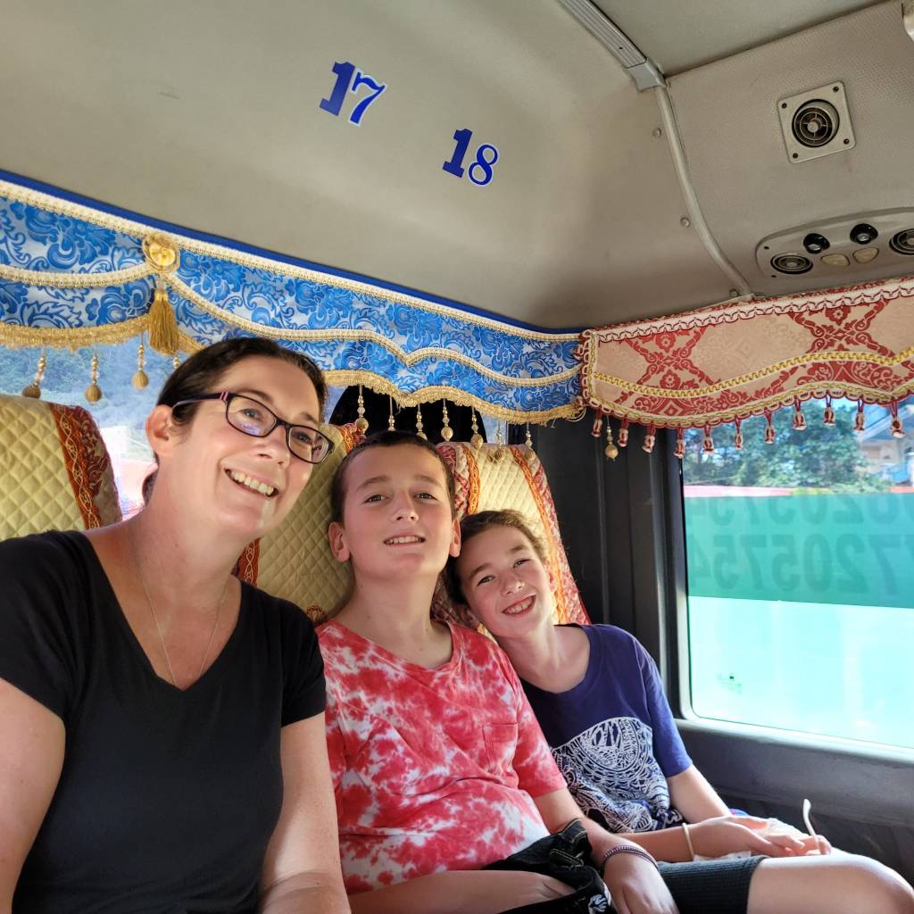 We were collected by a tuktuk from Kep Lodge after breakfast and taken into town to Kampot Transport, where a little bus pulled up about 15 minutes later and we climbed aboard to find the most fabulous decor for our journey to the border.