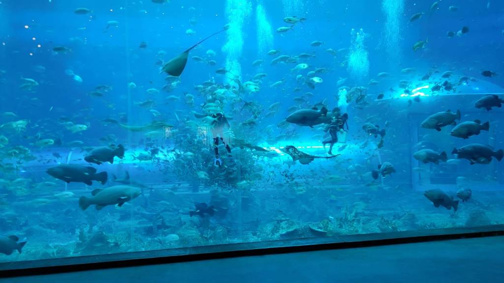 The Fish Feeding show was also in the main aquarium. It had divers who came down and fed the fish. They fed the manta rays and the big fish who just ate the sardines in one bite.