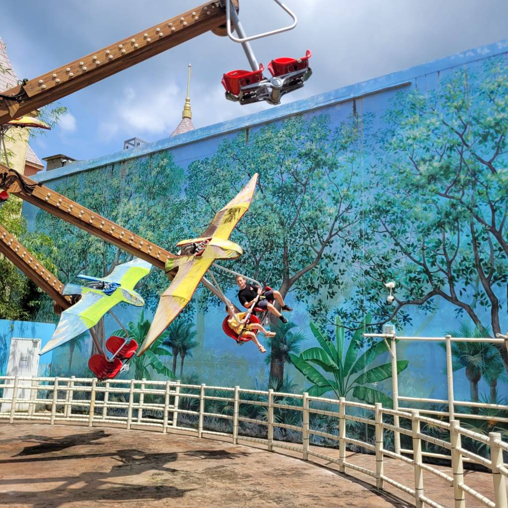 This was cool but I don’t think it was safe. Basically, you had these gliders and we thought we could control them, but we just got flung around the place and my legs almost hit a tree. It was the best ride in fantasy world though.