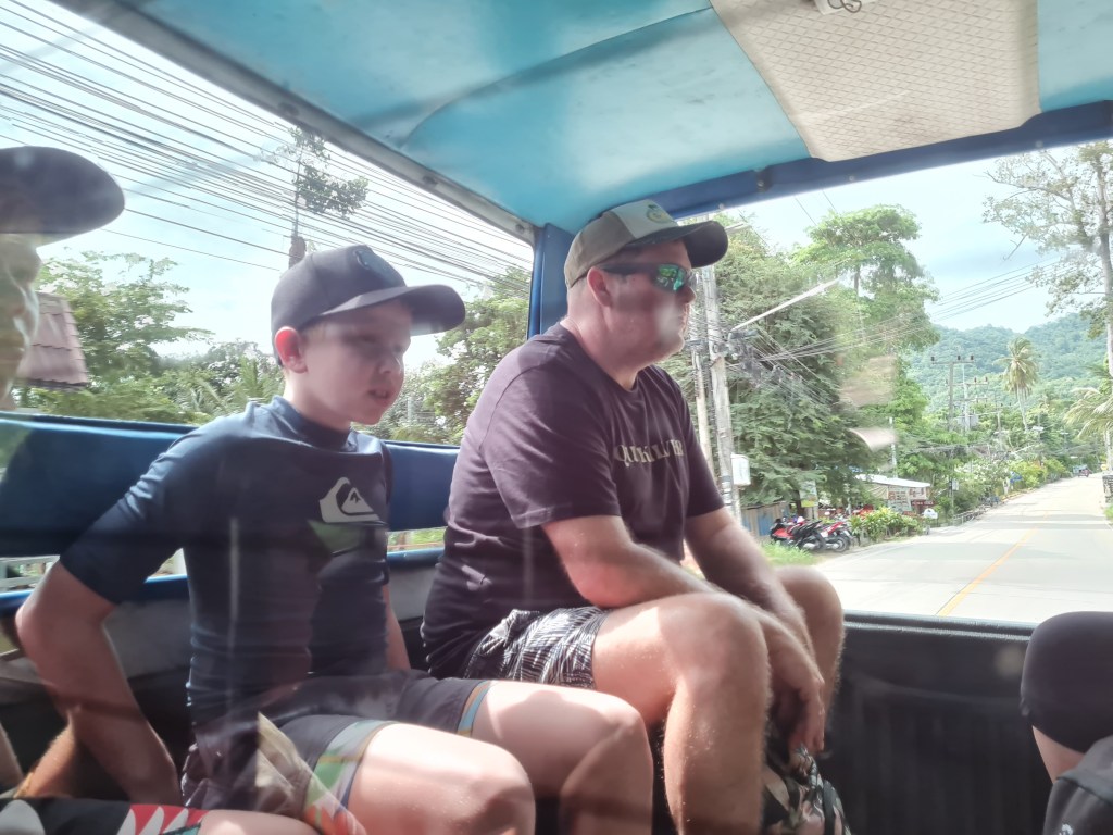 After a couple of relaxing days, we decided to leave the comfort of the resort and get a taxi over to Tanote Bay on the other side of the island. Nick and Sez had stayed over here years ago and were keen to revisit it. The taxis on Koh Tao are open-air, converted utes like Nissan Navaras, with bench seats on either side. They are surprisingly comfortable and fitted all nine of us in. The good thing about getting a ride over is that you can then get the driver’s WhatsApp details and call him when you’re ready to go back.