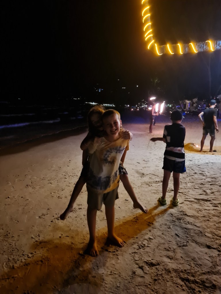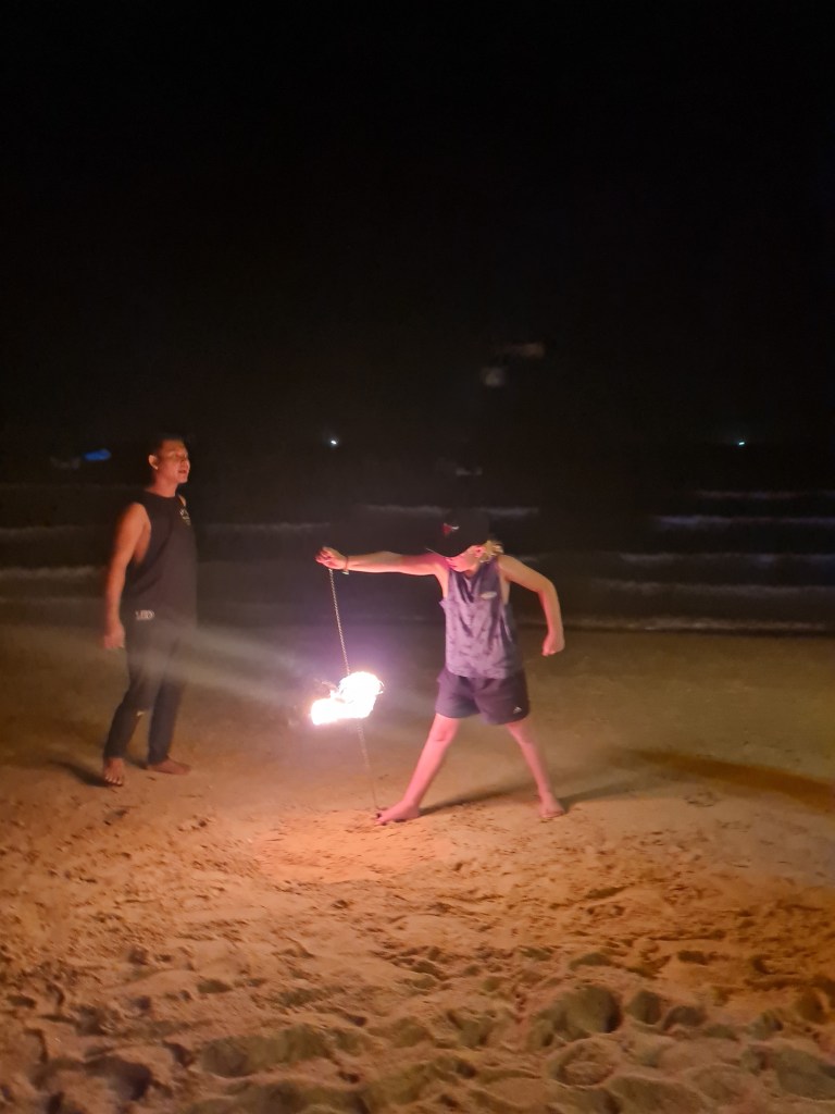 By the last night on Koh Tao, the kids had gotten brave enough to ask for a lesson, and the lovely fire dancer gave them some coaching, which they thoroughly enjoyed.