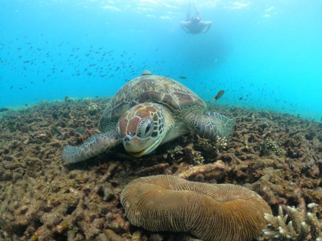 Our next stop was near the lighthouse, where we saw a large triggerfish as well as lots of other smaller, colourful fish, including some clownfish. After this, we stopped at a couple more spots, before heading to Shark Bay. This turned out to be a highlight of the trip as there are several turtles that come here to feed in the late afternoon. One of the guides had an underwater camera and took photos of people with the turtles, including most of our crew. It was so lovely to see turtles again, even if a lot of the coral around here appeared to be dead.