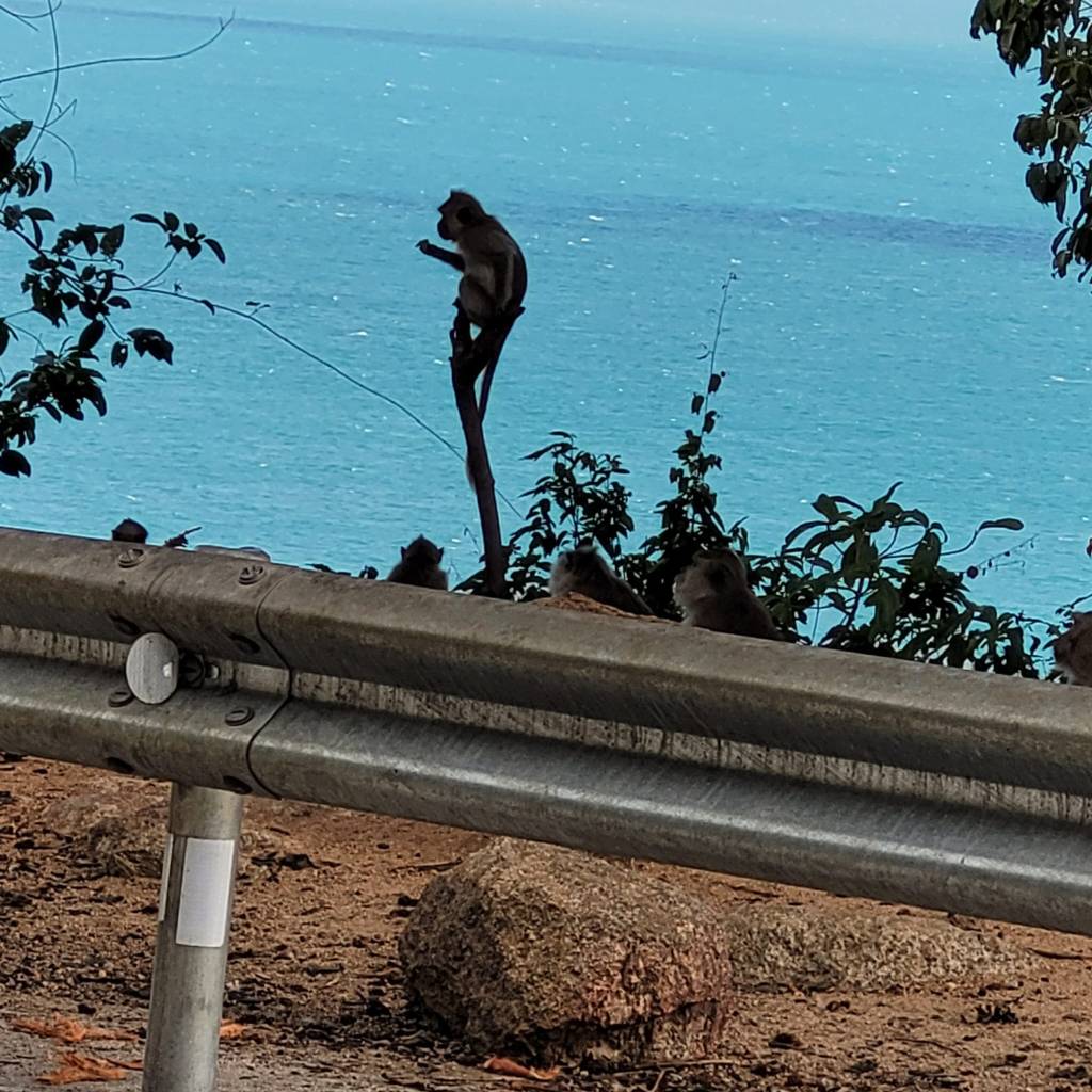 As we drove over the big hill leading to Haad Rinn Beach, we spotted loads of monkeys on the side of the road. Our driver stopped so we could look at them, but we chose to stay in the van and were content to look from across the road, because these monkeys were getting very familiar with the other tourists who had stopped, climbing all over their motorbikes. It seemed a little too close for comfort, having seen how aggressive monkeys can be if provoked.